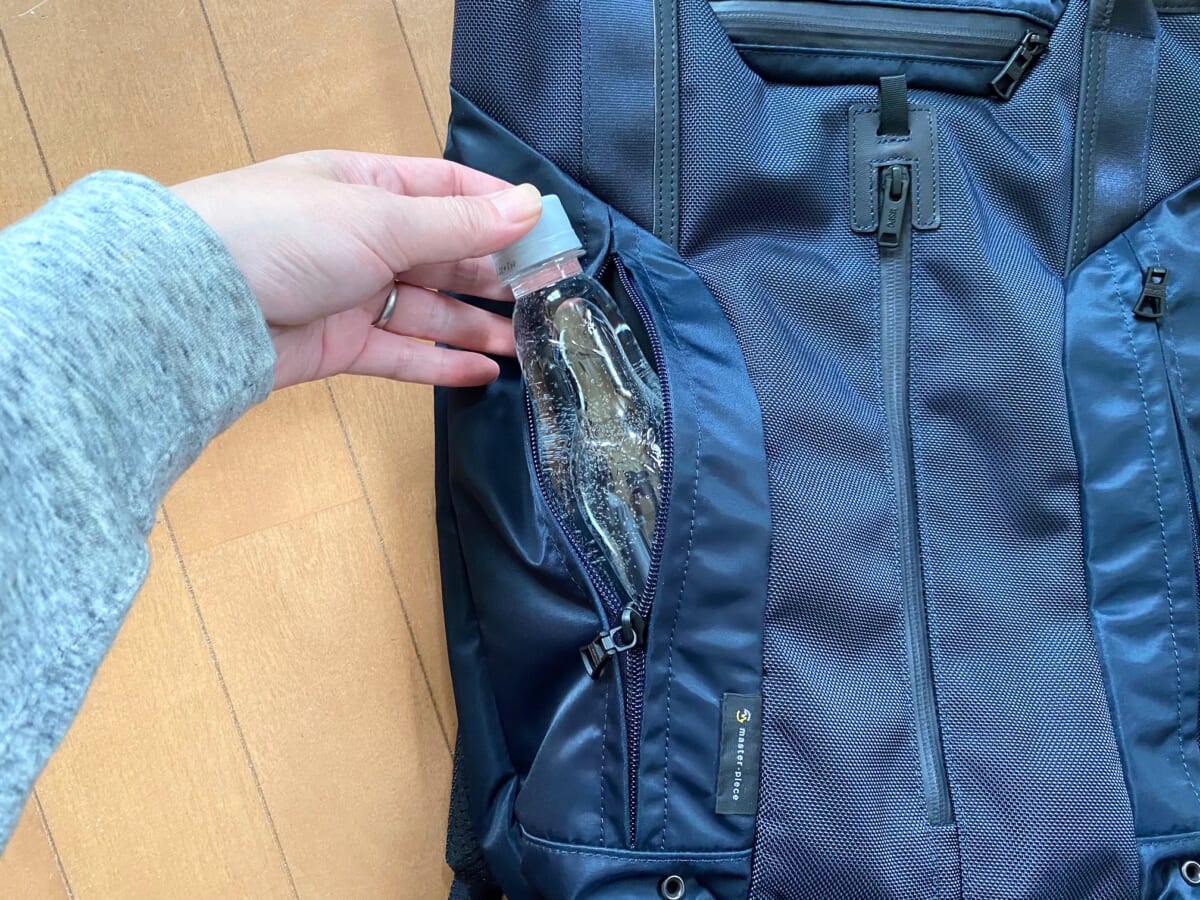 ↑サイドのポケットにはロールタイプのエチケット袋を簡単に取り出せる取り出し口を搭載。排泄物を入れた袋を吊り下げられるカラビナも付属しています