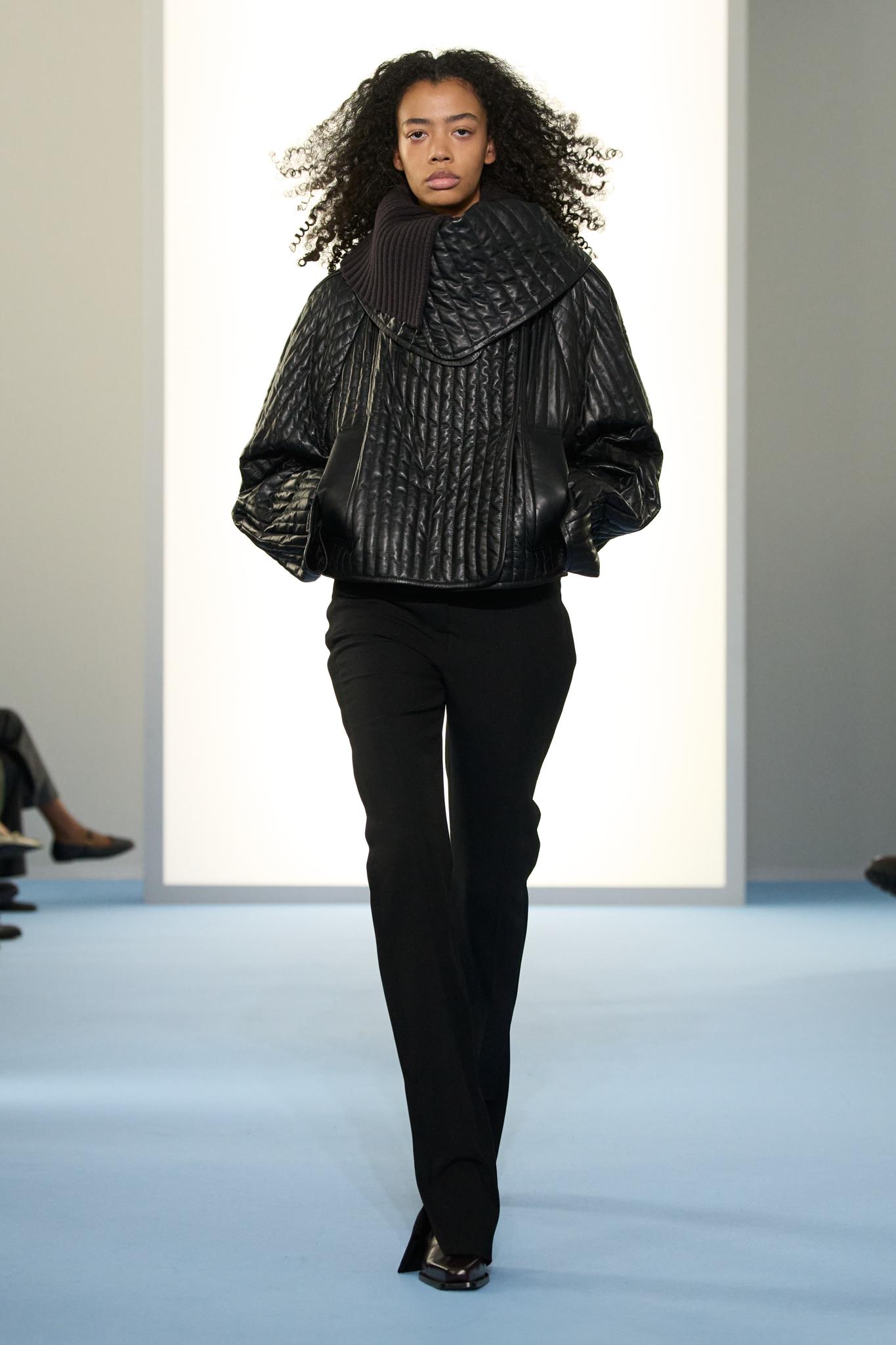古いお屋敷のような会場セットに、D-Shakeの激しいテクノが鳴り響く。 序盤は、メンズコレクションとも呼応するナロウなチェスターコート。テック素材のケープをレイヤードし、「スポーツ」と「クラシック」のリミックスを仕掛ける。ここまでは相反する要素を掛け合わせ、観客の価値観を揺さぶる、ある意味「プラダ」の十八番的手法だ。
