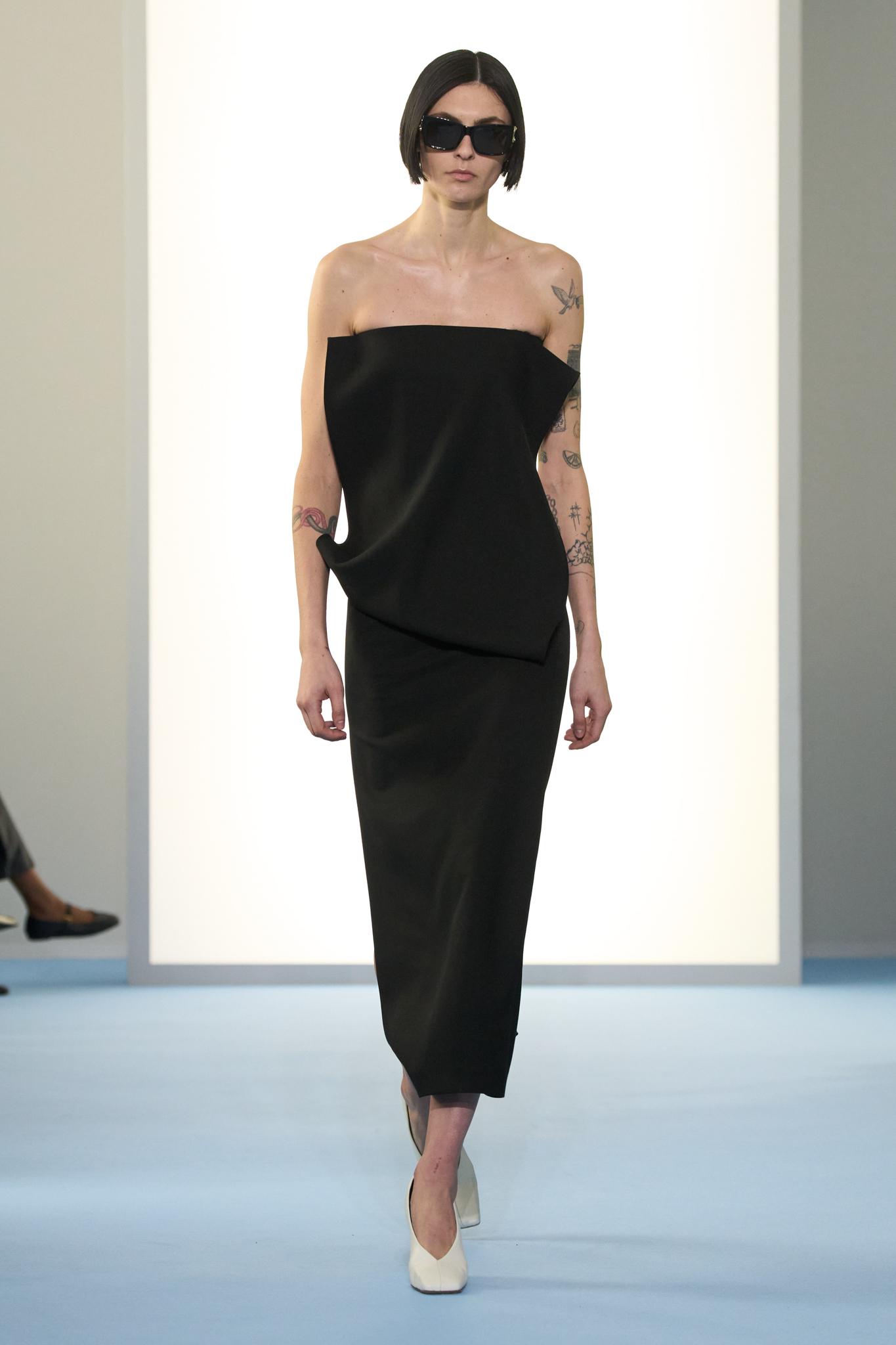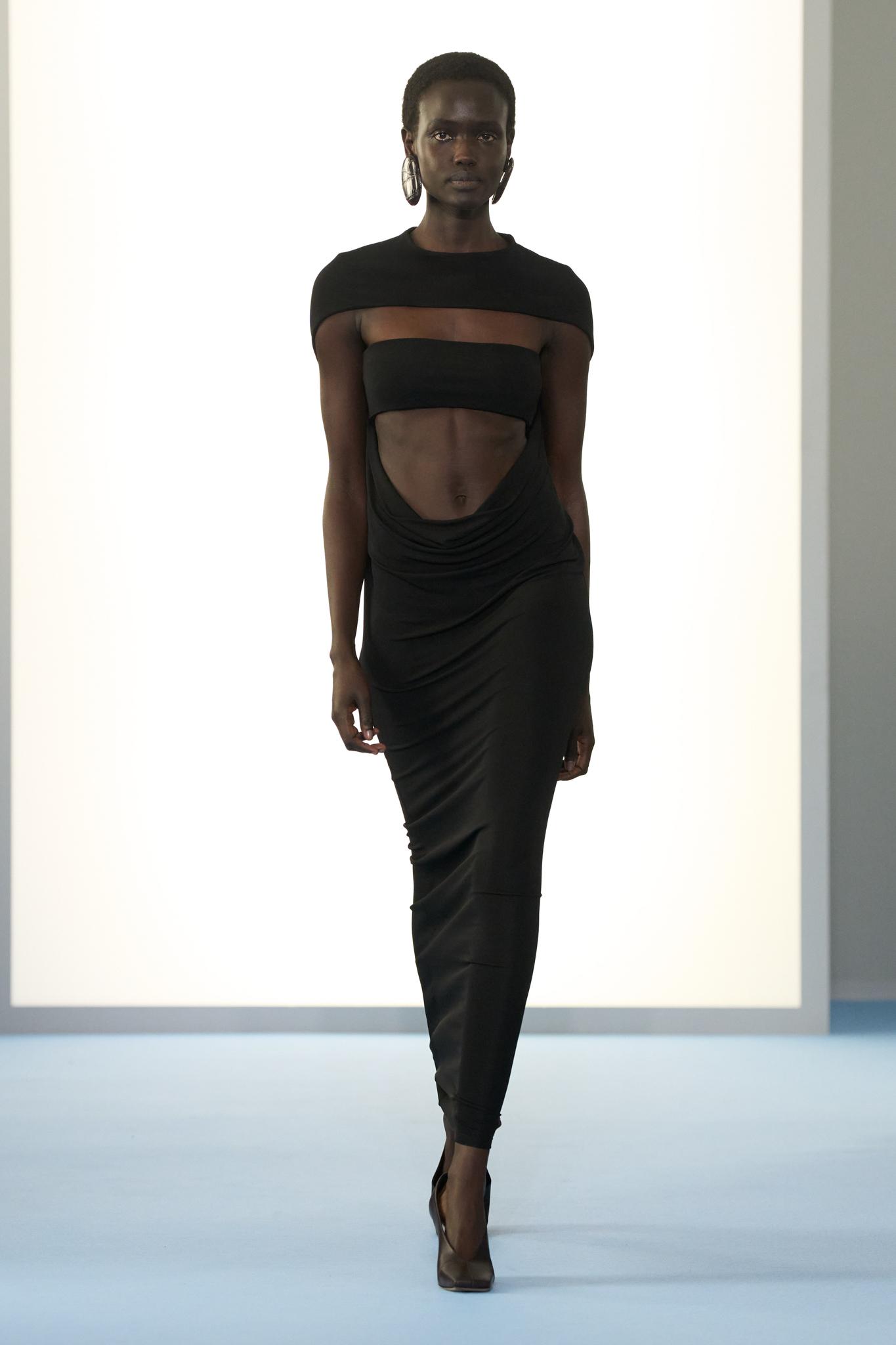 コート姿だったモデルは再びランウエイに現れ、バイカラーのジップアップニットに。そしてブラックドレス、最後はプライベートな時間を思わせるシアー素材のスリップドレスへと姿を変えた。同じモデルだと気づけないほど、表情が切り替わっていく。