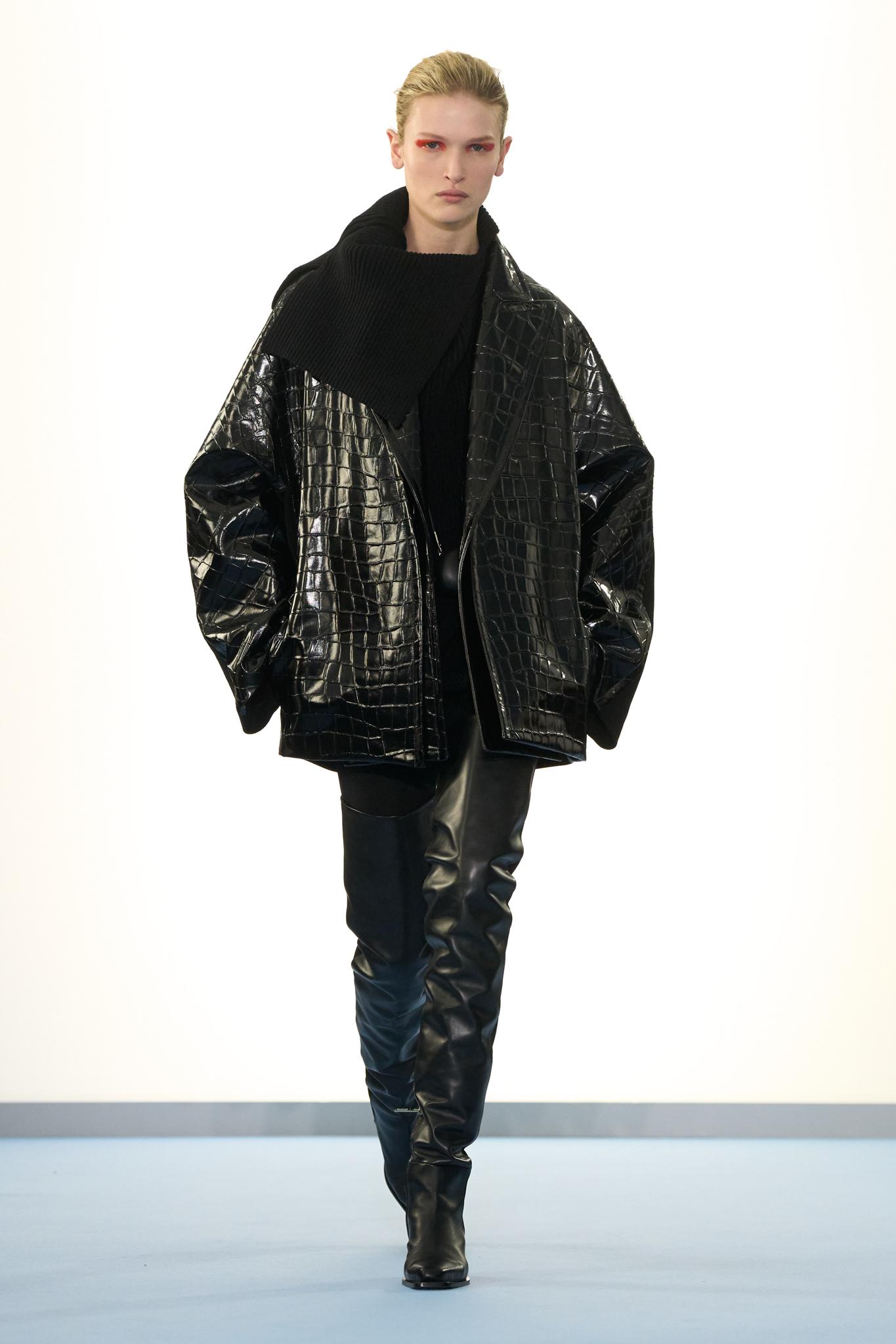 ファーストルックから、驚くほどシンプルだった。赤いリップと黒いアイシャドウが映える白人モデルが身に纏うのは、肌同様に真っ白なピタピタのミニドレス。ふくよかな胸とくびれたウエストをあからさまに強調するボディコンシャス具合だ。これに続いたのは、同じくピタピタのタートルネックのノースリーブにホワイトジーンズ姿の筋骨隆々な男性モデル。こちらも逞しい大胸筋やシックスパックが透けて見える。ポロシャツにデニム、レザーブルゾンにブラックデニム、真紅のスキッパータイプのポロニットにカラーデニムなど、アイテムは種類があれど、序盤はセカンドスキン級のボディコンシャスだったり、極細のペンシルシルエットだったり、そこに大きなスリットを刻んだり、生地を一部抉ったりで、モデルの体型を露骨に拾い強調する。男性なら力や理性、そして英雄性を、そして女性なら調和や柔らかさ、そして美しさを描こうとしたルネサンスの芸術運動をデムナらしいデザインコードで表現したかのようだ。