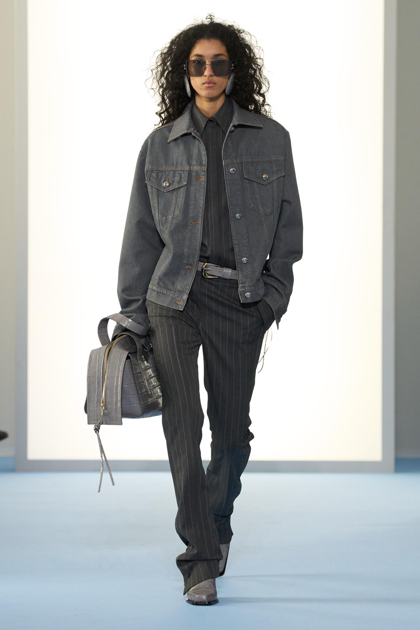 帽子は、ある(笑)。アルマーニ氏への敬意なのだろう、ファーストルックは、アンコンのダブルのジャケットに楊柳パンツ、そしてキャスケットのスタイルだった。しかしジャケットは時にしっかり肩を作り、アンコンが“当たり前”ではないことを印象づける。合わせるのは、ビンテージ加工を施したデニムシャツにバーガンディのネクタイ。同じくビンテージのムードが漂うオーバーサイズのレザーブルゾンやアビエイタージャケット、ワンピース感覚のモヘアのロングニット、腰履きするタック入りのデニムパンツ、チューリップシルエットのバルーンスカートなど、アルマーニ氏のランウエイではあまり見かけなかったアイテムが続々と現れ、「世代交代」感を印象づけた。装飾は控えめ。特にスパンコールなどはほとんど登場せず、ジャケットのラペルにライオンのブローチをあしらう程度だ。