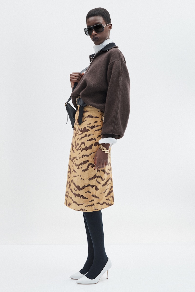 今季も表情豊かな素材がコレクションを彩りました。シルクやカシミアといった上質なファブリックに加え、パイソンやスネークを思わせるモチーフ、色のバリエーションによってニュアンス豊かに輝くスパンコールなど、多彩なテクスチャーが印象を残します。今シーズンは、歴代の米国大統領にも愛されてきたファブリックハウス「スカラマンドレ(Scalamandré)」とのコラボレーションによる、アイコニックなタイガーモチーフも登場しました。また、フランスで生産を行う新作バッグも披露されました。今年はいよいよ日本上陸を控えているとのことで、日本での展開にも注目が集まりそうです。