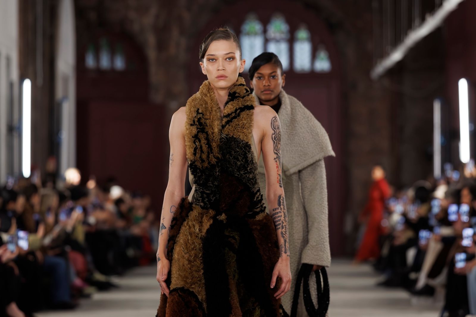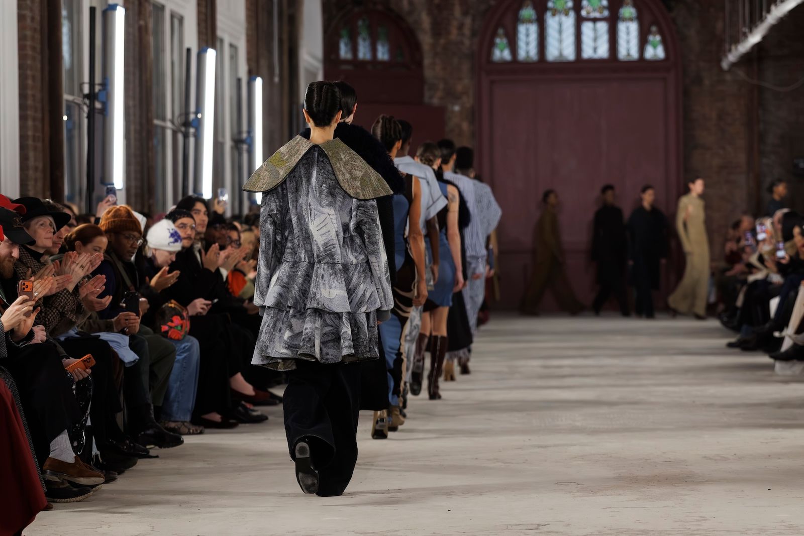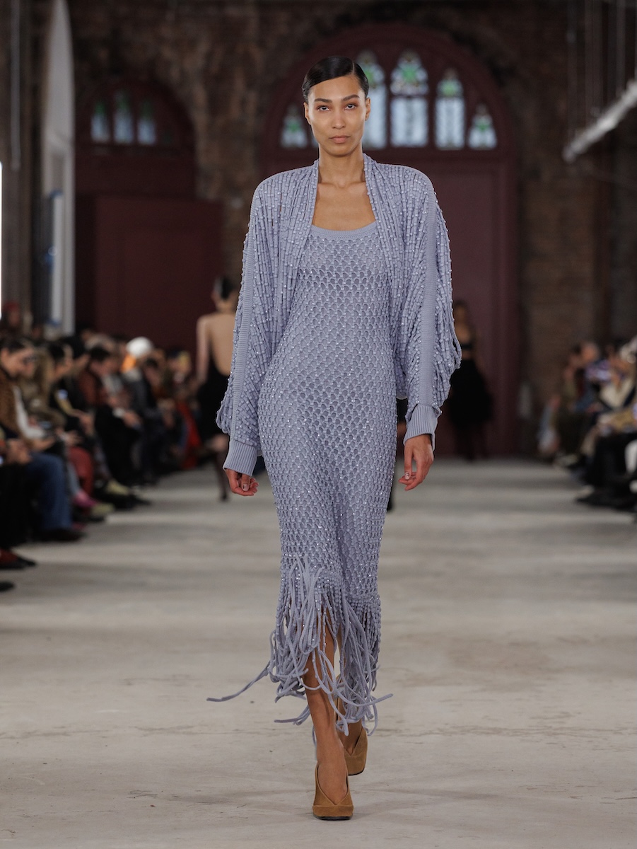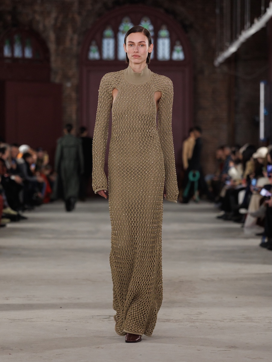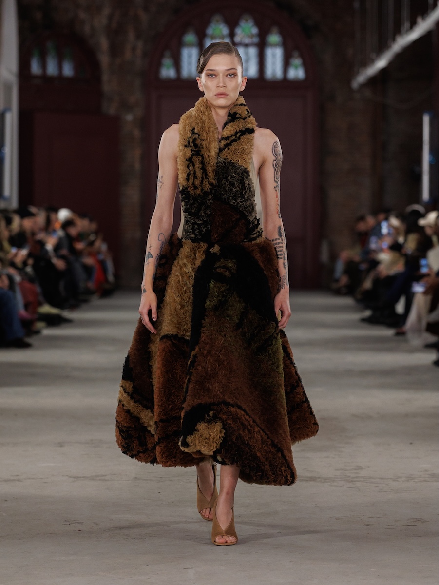 スコットはこれまでもクラフトへの強いコミットメントを掲げてきましたが、今シーズンは「ファム・シュヴァル」を直接的に引用するなど、その姿勢をいっそう明確に打ち出しました。ラムの作品が持つ複雑な層構造と色彩の強度を表現するため、ゴブランジャカードやウールシルクのキャンバス地へのデジタルプリント、手作業によるオーガンジーのインターシャといった高度な技法を採用。重層的なテクニックによって思想を可視化したコレクションには、ファッションを通じて時代に働きかけようとするスコットの強い意志が確かに宿っていました。
