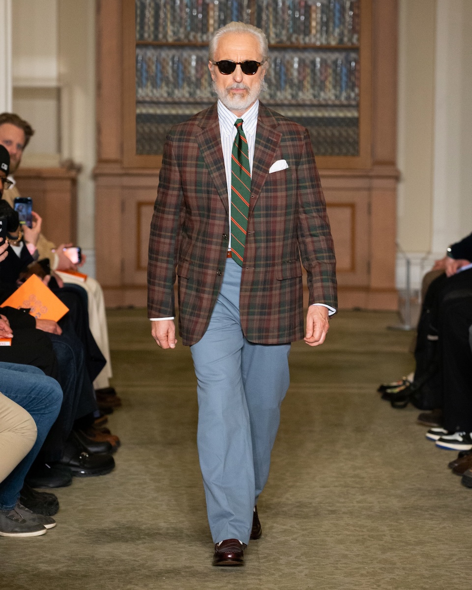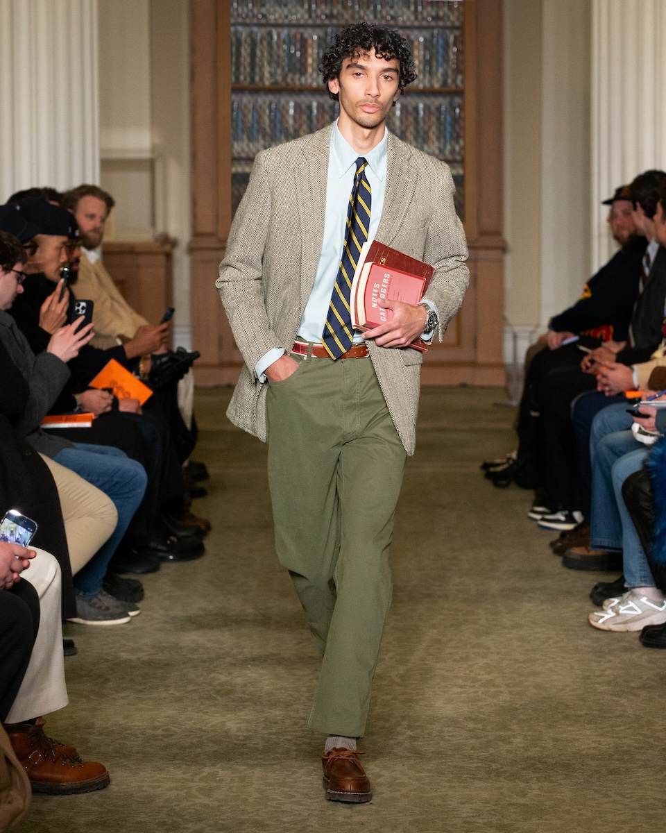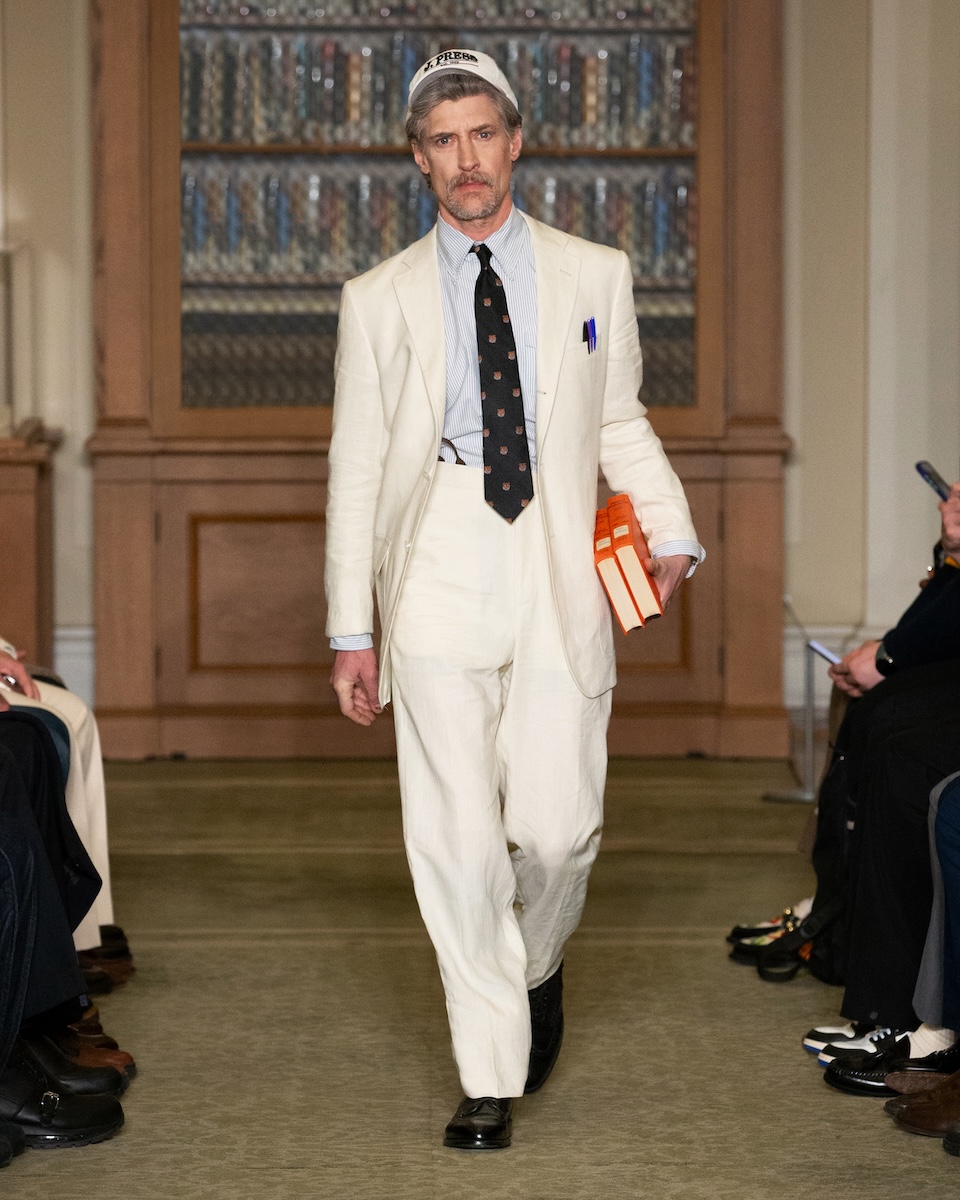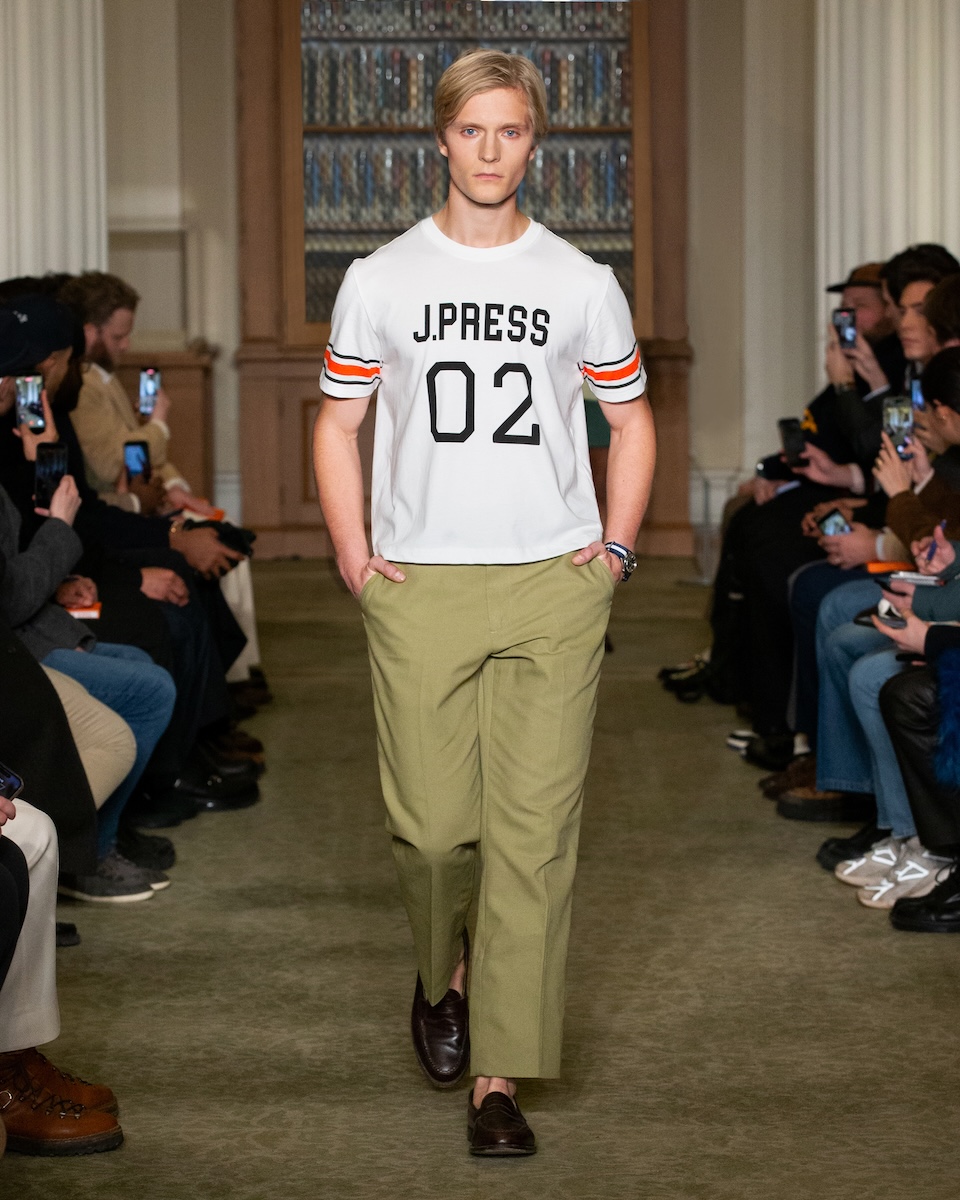 カールソンは「WWD」のインタビューに対し、こう語っています。「何か急進的な変化を起こすことではなく、徹底的に『J.プレス』とアイビーの原点に立ち返ることです。スタイリングは徹底してアイビーらしく、プロダクトは真にクラシックなアメリカンスタイルであることを意識しています」。アイビーがより開かれた人たちのものであるこということを訴求するため、様々な人種や年齢のモデルをキャスティングを意識していました。カールソン氏の言葉通り、ランウェイには正統派のアイビースタイルに身を包んだモデルたちが次々に登場してきました。「多くのブランドが再解釈やツイストを試みる中で、徹底してトラディショナルであるためには、リサーチを重ね、深く研究することが欠かせません。最も大きなポイントは“テクスチャー”です」。その言葉通り、客席とランウェイの距離が近い会場では、細かな素材のディテールまで確認することができました。生地の開発に相当な時間を費やしたという、ハリスツイードのように見えるコットンやリネン、さらにトラウザーズにはストーンウォッシュやガーメントダイの加工を施すことで、奥行きのある色合いが表現されています。