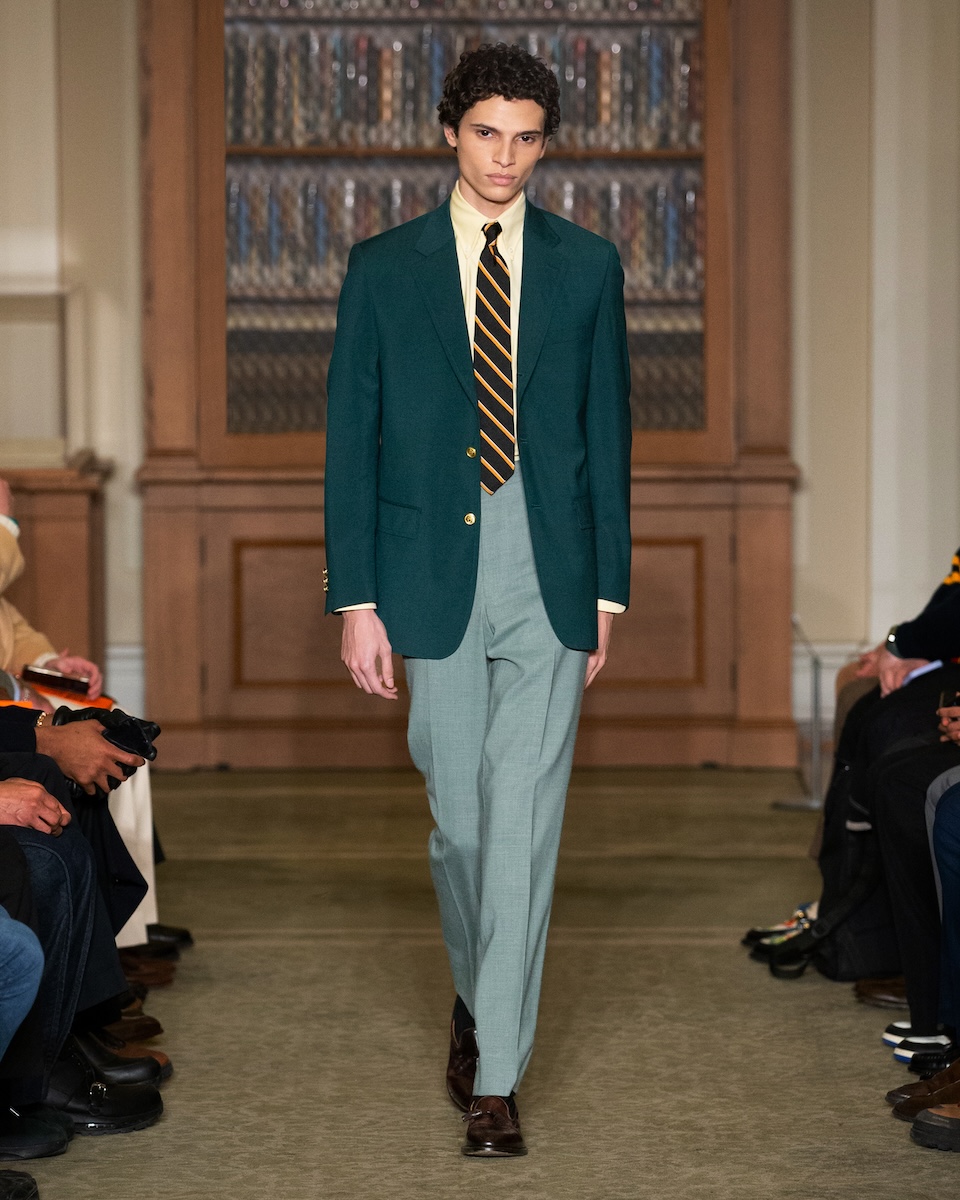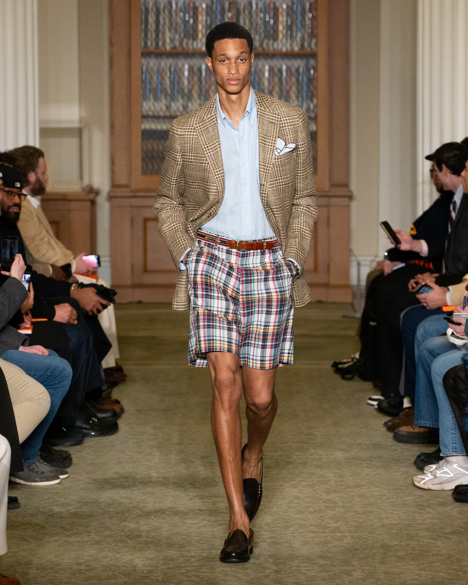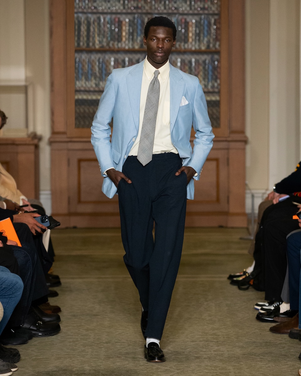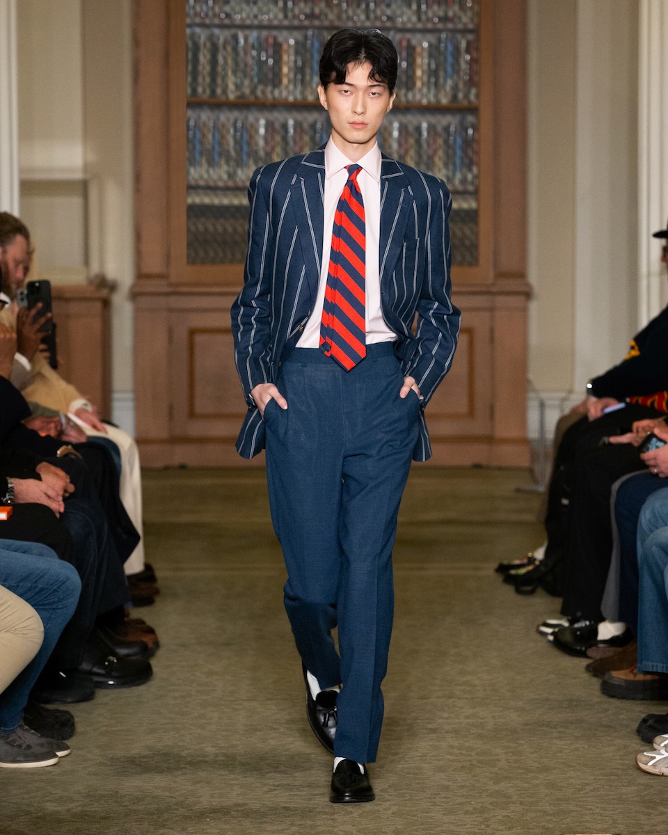 カールソンは「WWD」のインタビューに対し、こう語っています。「何か急進的な変化を起こすことではなく、徹底的に『J.プレス』とアイビーの原点に立ち返ることです。スタイリングは徹底してアイビーらしく、プロダクトは真にクラシックなアメリカンスタイルであることを意識しています」。アイビーがより開かれた人たちのものであるこということを訴求するため、様々な人種や年齢のモデルをキャスティングを意識していました。カールソン氏の言葉通り、ランウェイには正統派のアイビースタイルに身を包んだモデルたちが次々に登場してきました。「多くのブランドが再解釈やツイストを試みる中で、徹底してトラディショナルであるためには、リサーチを重ね、深く研究することが欠かせません。最も大きなポイントは“テクスチャー”です」。その言葉通り、客席とランウェイの距離が近い会場では、細かな素材のディテールまで確認することができました。生地の開発に相当な時間を費やしたという、ハリスツイードのように見えるコットンやリネン、さらにトラウザーズにはストーンウォッシュやガーメントダイの加工を施すことで、奥行きのある色合いが表現されています。