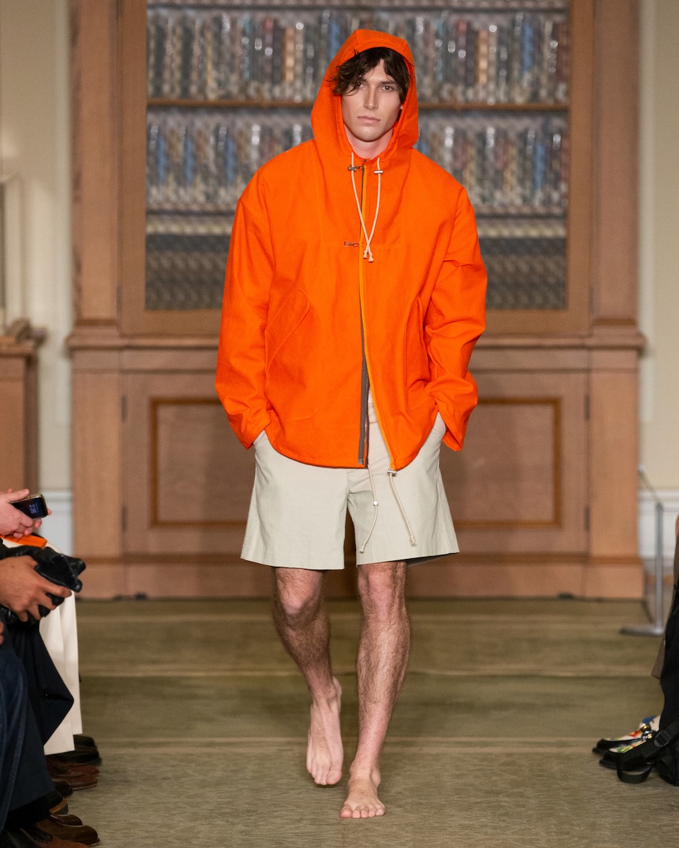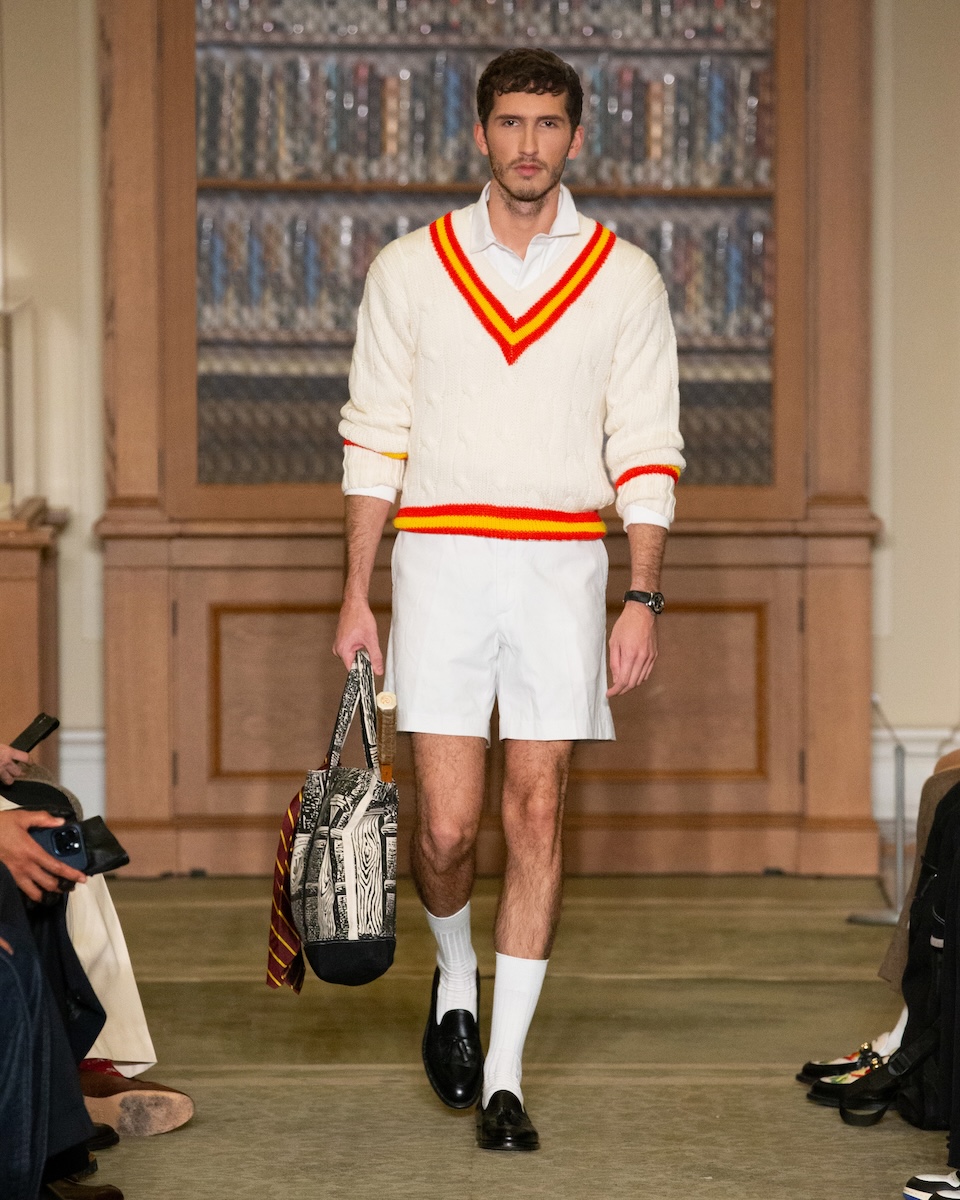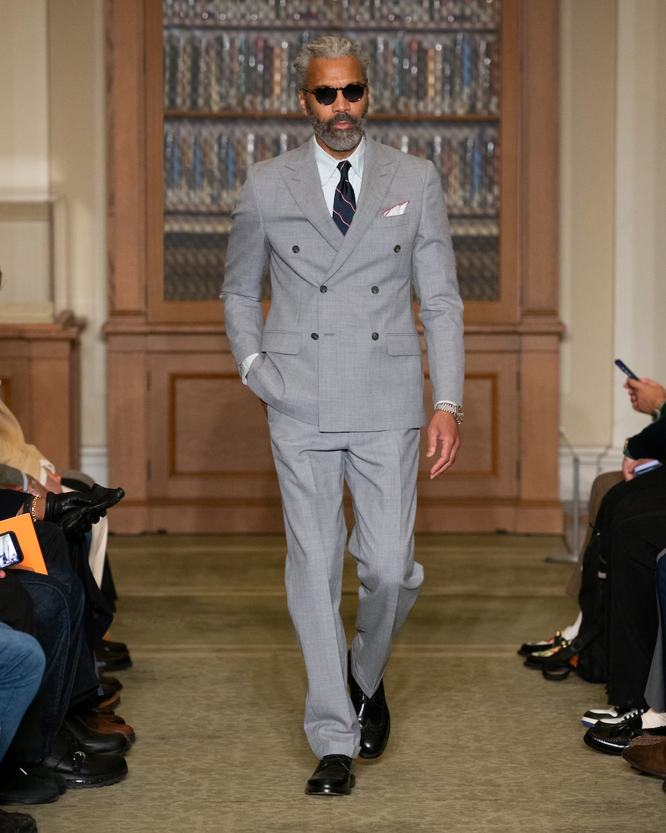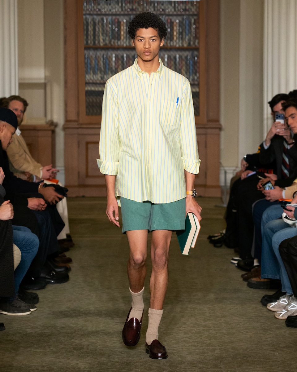 カールソンは「WWD」のインタビューに対し、こう語っています。「何か急進的な変化を起こすことではなく、徹底的に『J.プレス』とアイビーの原点に立ち返ることです。スタイリングは徹底してアイビーらしく、プロダクトは真にクラシックなアメリカンスタイルであることを意識しています」。アイビーがより開かれた人たちのものであるこということを訴求するため、様々な人種や年齢のモデルをキャスティングを意識していました。カールソン氏の言葉通り、ランウェイには正統派のアイビースタイルに身を包んだモデルたちが次々に登場してきました。「多くのブランドが再解釈やツイストを試みる中で、徹底してトラディショナルであるためには、リサーチを重ね、深く研究することが欠かせません。最も大きなポイントは“テクスチャー”です」。その言葉通り、客席とランウェイの距離が近い会場では、細かな素材のディテールまで確認することができました。生地の開発に相当な時間を費やしたという、ハリスツイードのように見えるコットンやリネン、さらにトラウザーズにはストーンウォッシュやガーメントダイの加工を施すことで、奥行きのある色合いが表現されています。