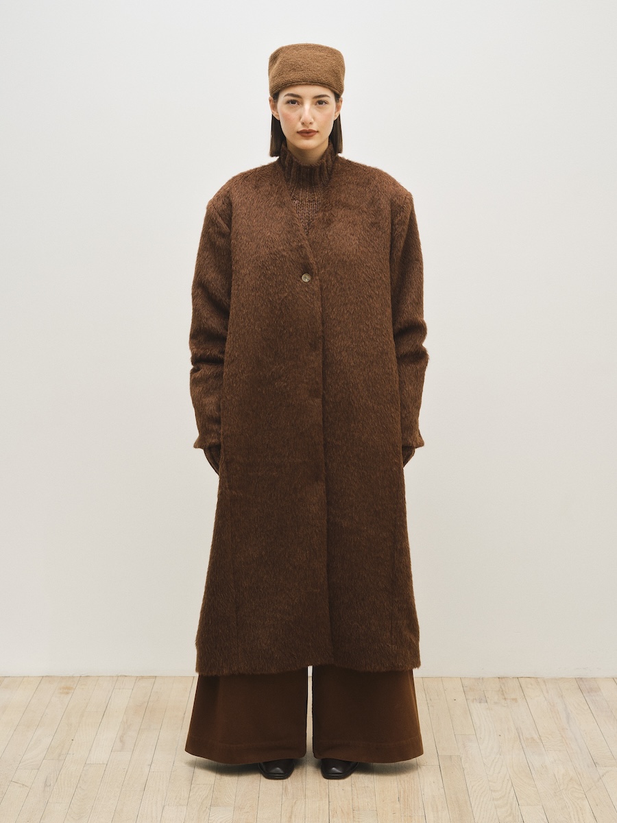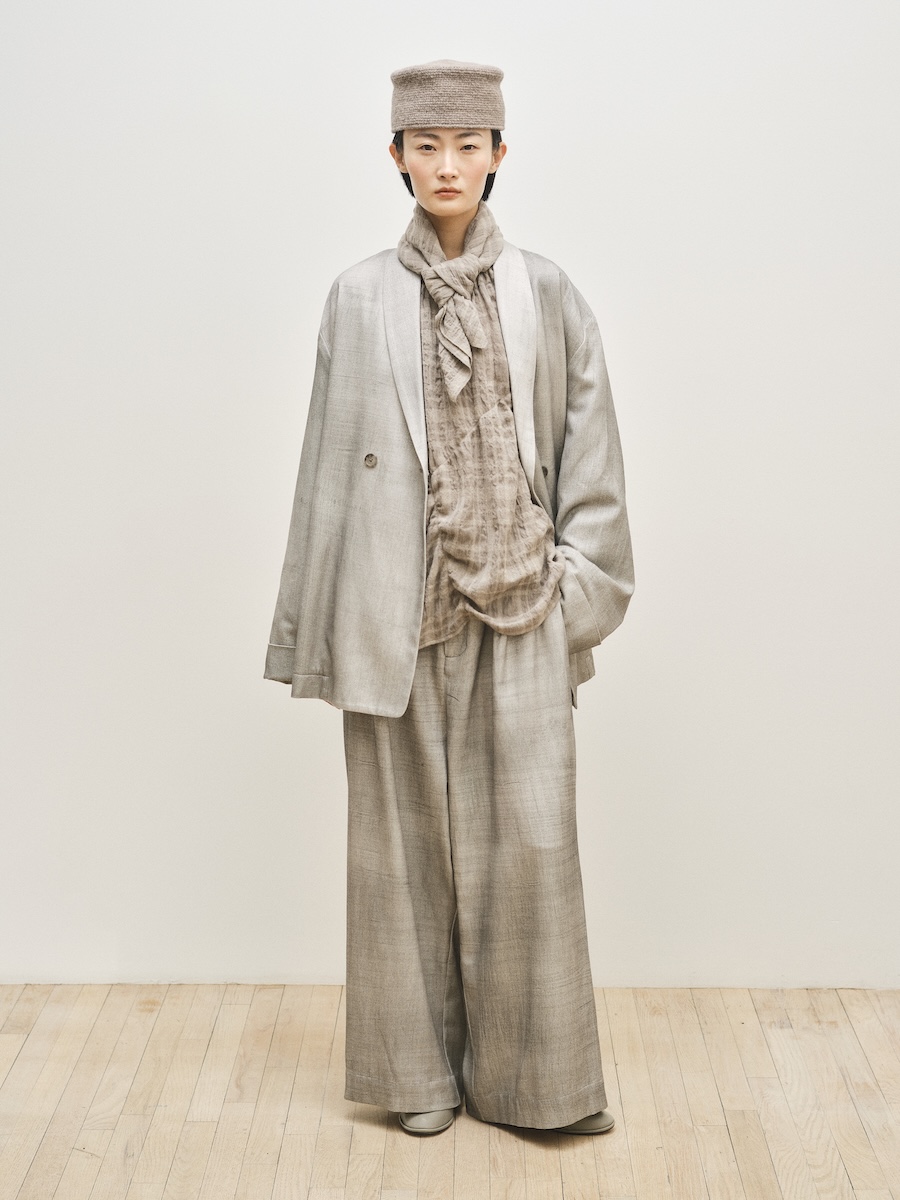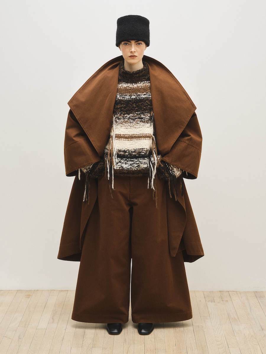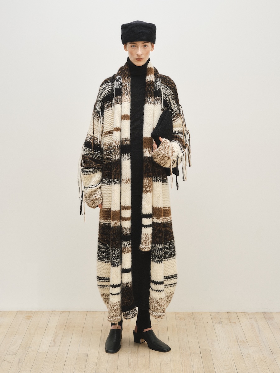 ニューヨークを拠点に2008年に設立された「ローレン マヌーギアン(LAUREN MANOOGIAN)」は、ペルーで調達されたアルパカをはじめとする自然素材を用い、現地工房と継続的なパートナーシップのもとコレクションを発表しています。派手な装飾やロゴに頼ることなく、ニットを軸にクラフトマンシップによって素材の表情を丁寧に引き出すその佇まいには、静かな強さが漂います。アルパカやカシミヤ、メリノウールなど自然由来の素材本来の色味を生かしたニュートラルなカラーパレットもまた、凛とした品格と自然の力強さを感じさせます。展示会では、ベージュやエクリュ、テラコッタ、ブラウンなど大地を思わせる色調が繊細なグラデーションを描き、シックで穏やかな世界観を形づくっていました。