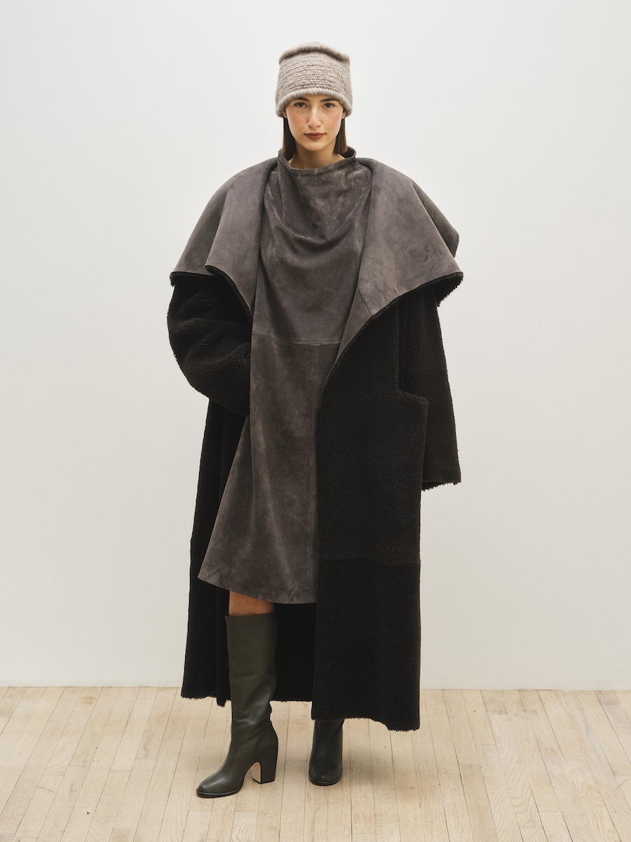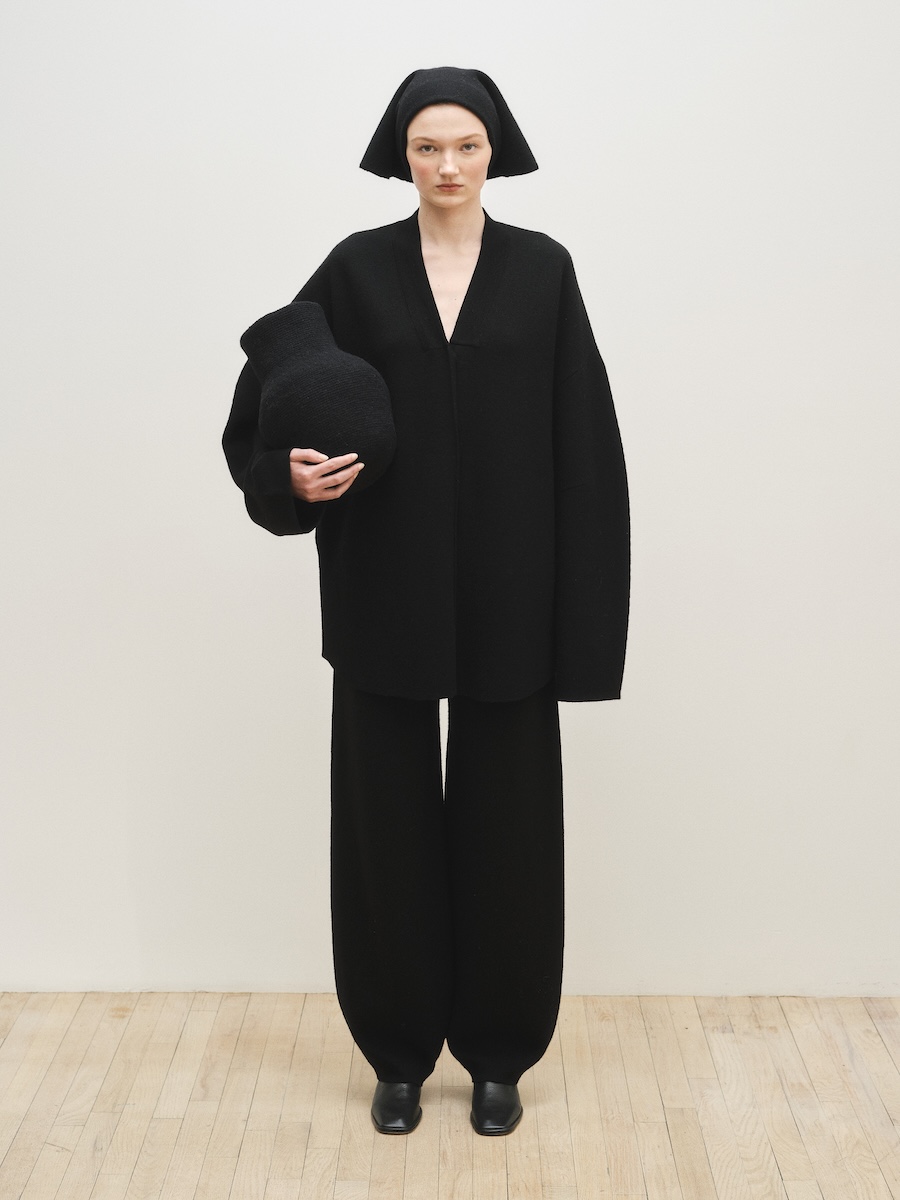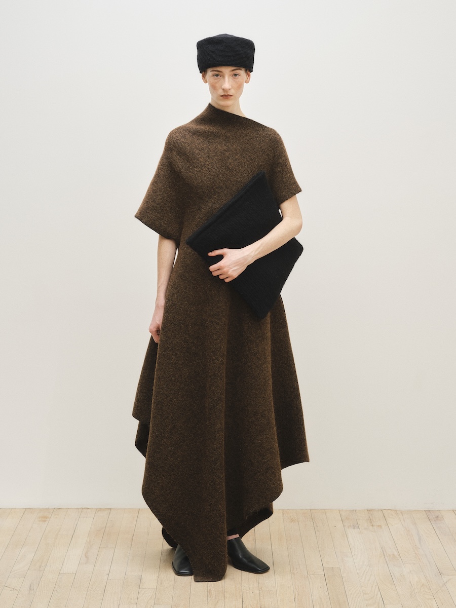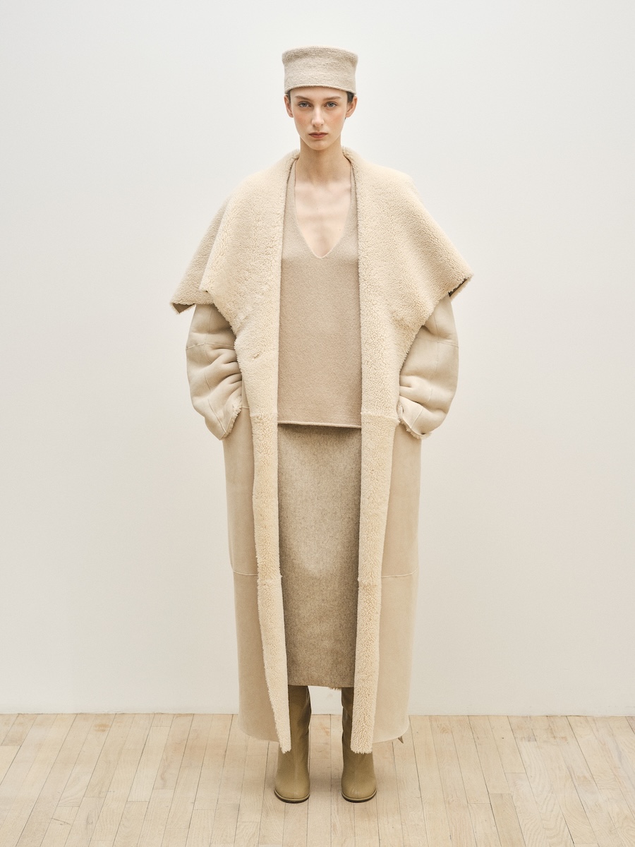 ニューヨークを拠点に2008年に設立された「ローレン マヌーギアン(LAUREN MANOOGIAN)」は、ペルーで調達されたアルパカをはじめとする自然素材を用い、現地工房と継続的なパートナーシップのもとコレクションを発表しています。派手な装飾やロゴに頼ることなく、ニットを軸にクラフトマンシップによって素材の表情を丁寧に引き出すその佇まいには、静かな強さが漂います。アルパカやカシミヤ、メリノウールなど自然由来の素材本来の色味を生かしたニュートラルなカラーパレットもまた、凛とした品格と自然の力強さを感じさせます。展示会では、ベージュやエクリュ、テラコッタ、ブラウンなど大地を思わせる色調が繊細なグラデーションを描き、シックで穏やかな世界観を形づくっていました。