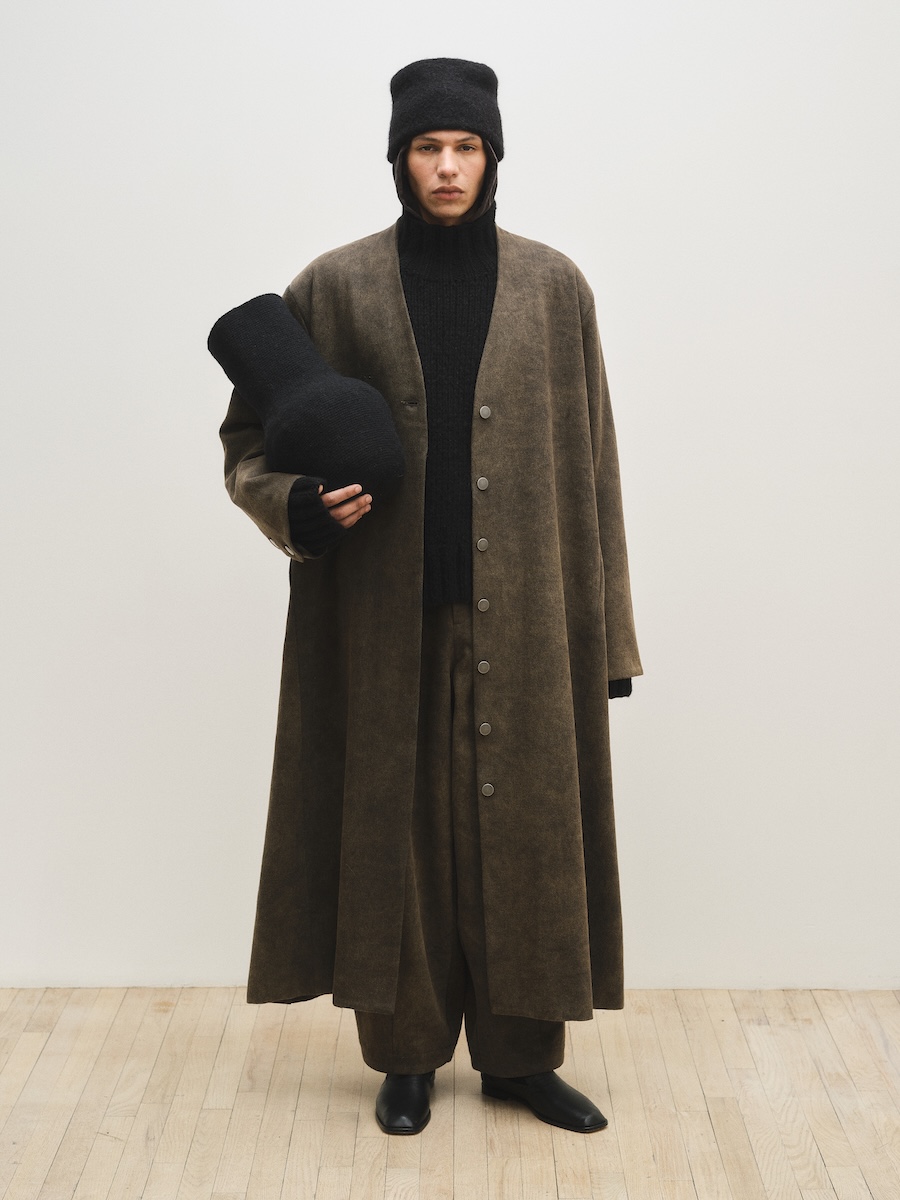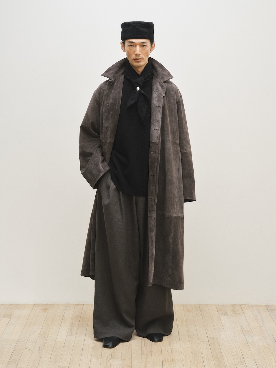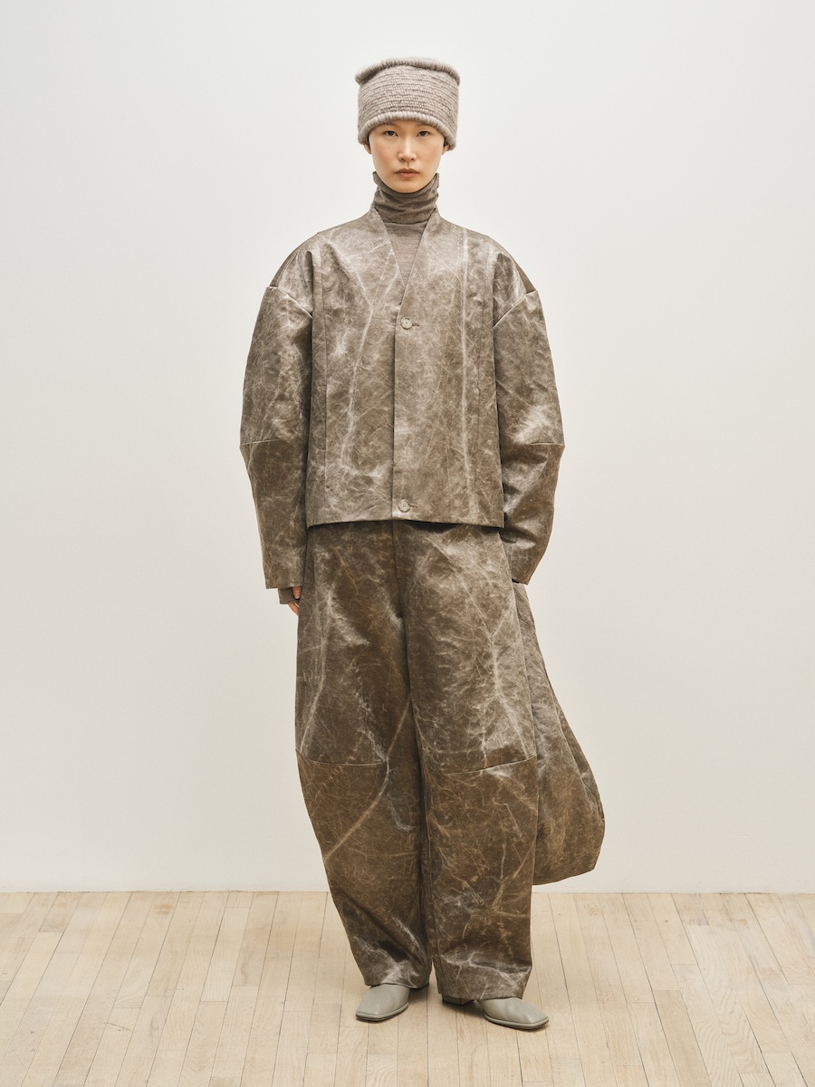 布帛ではコットンに加え、リネンやパイナップル繊維を混紡したコットンなどの素材も開発。ベロアのような光沢や鉄を思わせる質感を生み出す柿染め、コットンにハンドペイントを施して染めのような質感を生み出すなど、素材選びだけでなく加工技術へのこだわりも随所に見られます。自然由来の素材が持つ不均一なテクスチャーには、大地を思わせる力強さが表れています。ルックでは温かみのあるニットとのレイヤードによってコントラストを生み出し、スエードやムートンの重厚なアウターがコレクション全体に存在感を与えていました。