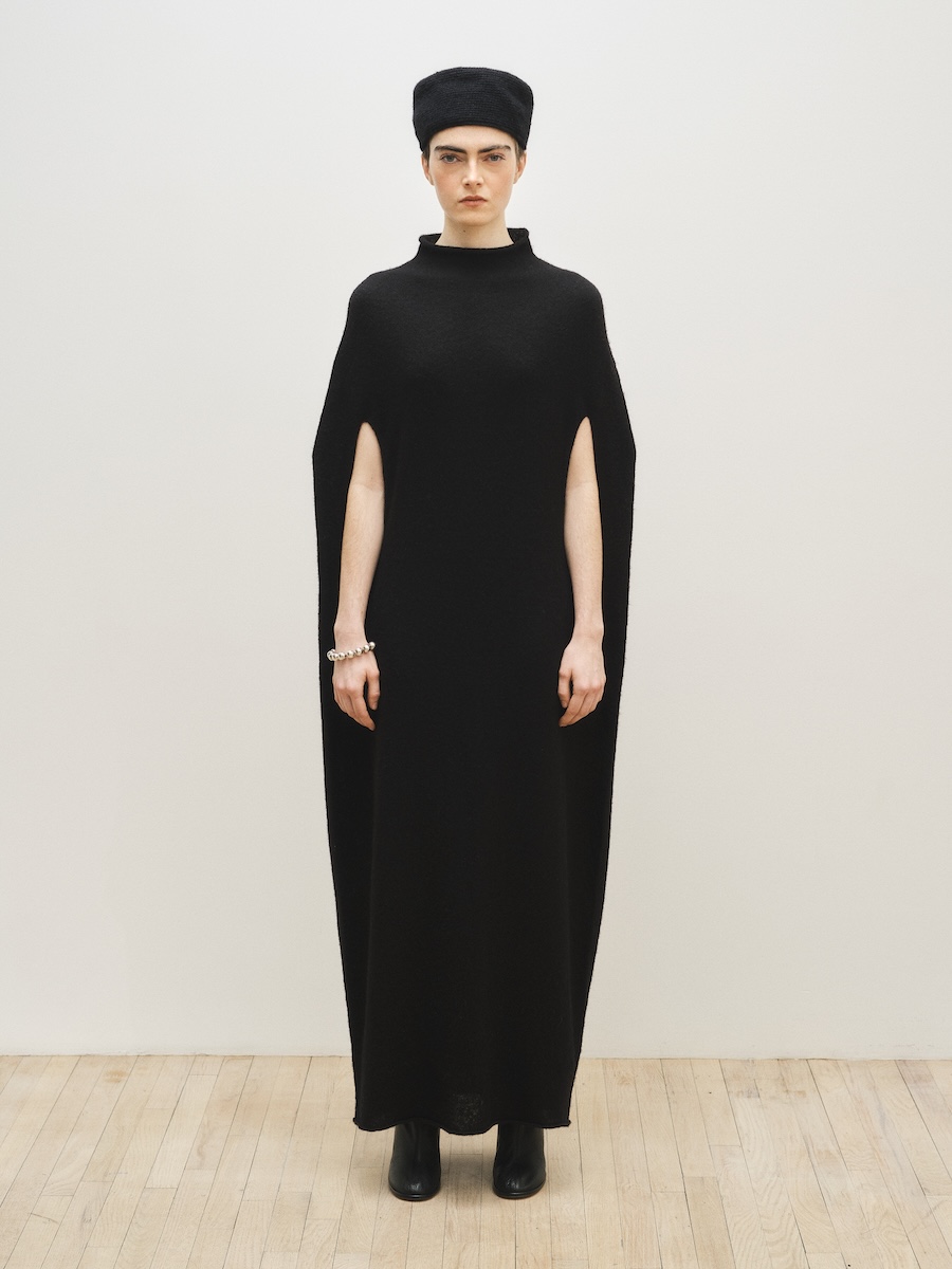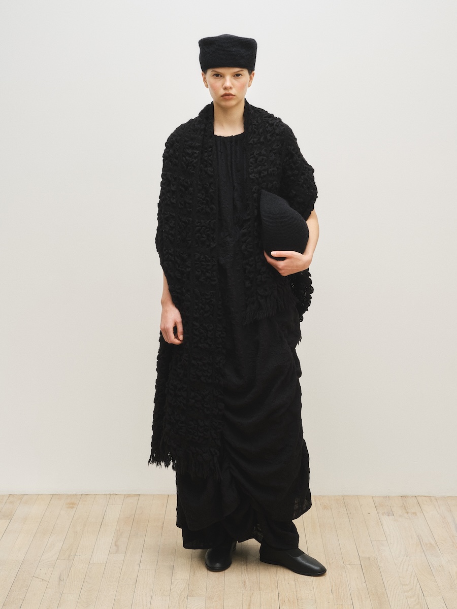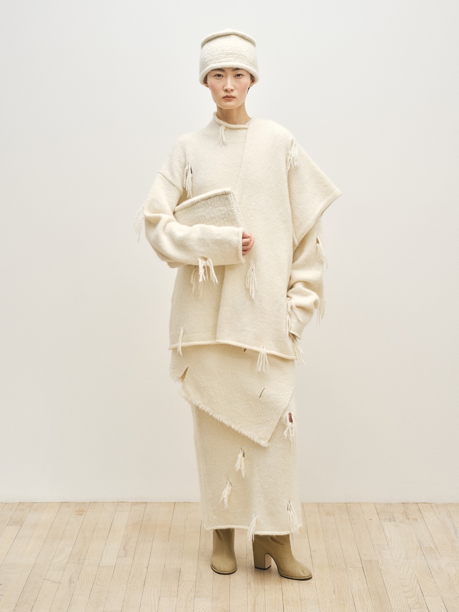今シーズンはブランドの象徴であるニットウェアを軸に、布帛や重衣料のバリエーションも広がり、コレクション全体に厚みが加わりました。ニットは編み地やフォルムによって、布帛は加工によって、それぞれ異なる表情を見せています。あえて裏地を見せることで裁断された毛糸をフリンジのように見せたニットや、泡のように立体的に編まれたもの、ざっくりとした編み地のニットなど、クラフト特有の温もりを感じさせるアイテムが並びました。不完全さをあえて残したテクニックには、手仕事ならではの力強さが表れています。