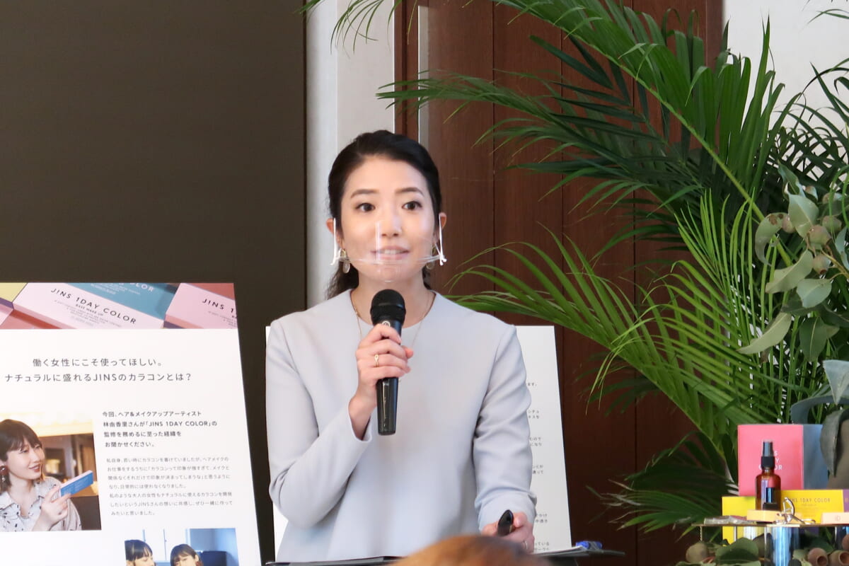 ジンズ ワンデー カラーは、ヘアメイクアップアーティスト林由香里氏監修のもと開発。着色部分をレンズで挟み込むことで色素が直接目に触れることなく装用可能な「サンドイッチ構造」を採用することで品質を担保しながら、「カラコン=メイク」と定義し、繊細な色味と発色にこだわることで、大人の女性が着けたいと思えるカラコンとなっています。毎日使えるナチュラルカラー「BASE MAKE UP」と、雰囲気を変えるアクセントカラー「POINT MAKE UP」の2つのシリーズ。さらにそのシリーズの中でも各4色ラインナップしています。