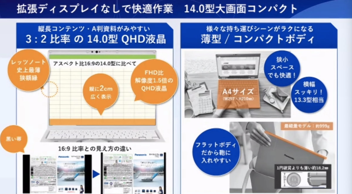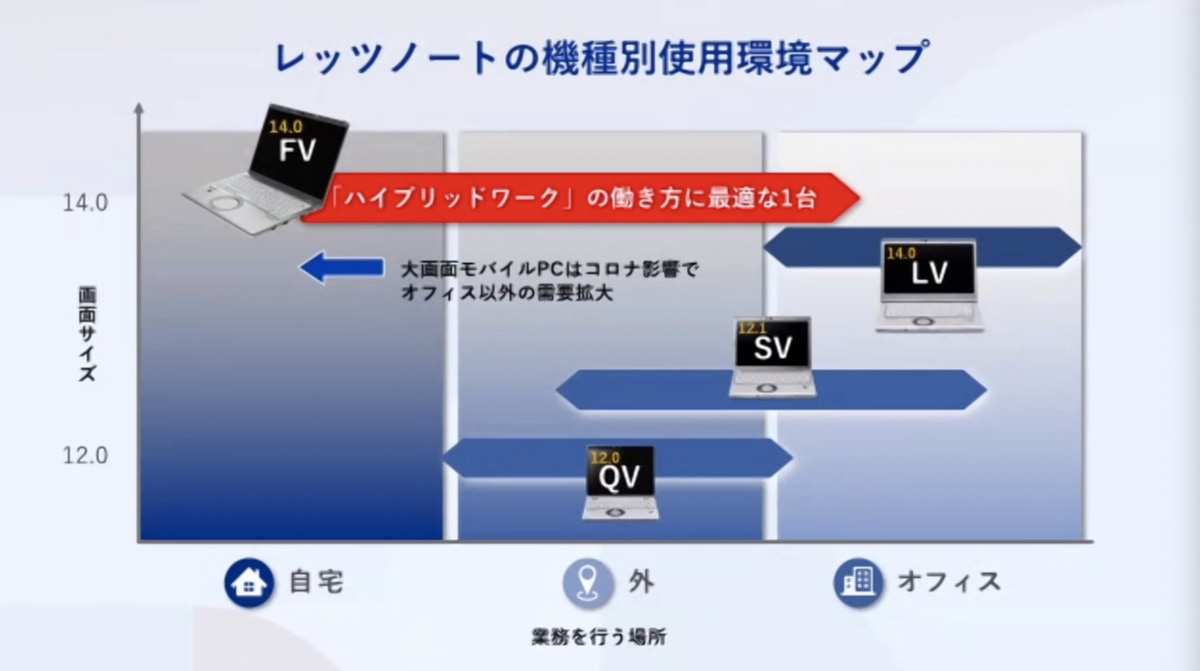 個人向け店頭モデルは「CF-FV1GFNQR(Core i7-1165G7、16GBメモリー、512GB SSD、Office Home & Business 2019)」、「CF-FV1FDMQR(Core i5-1135G7、16GBメモリー、512GB SSD、Office Home & Business 2019)」、「CF-FV1FDSQR(Core i5-1135G7、16GBメモリー、256GB SSD、Office Home & Business 2019」、「CF-FV1FDWQR(Core i5-1135G7、8GBメモリー、256GB SSD)」の4種類を用意。