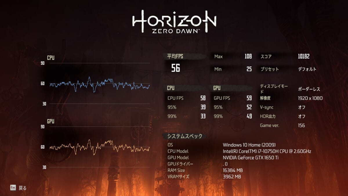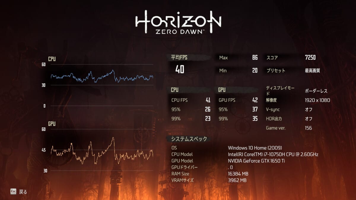 続いて「Horizon Zero Dawn」は、ゲーム内ベンチマークモードでフレームレートを計測しました。画質設定はゲーム開始時点の設定である「デフォルト」と、よりリッチな「最高画質」の2パターンを試しています。結果は「デフォルト」設定時が平均56fps、「最高画質」設定時が平均40fpsと、どちらも目安となる60fpsには届いていません。本作はオープンワールドを舞台にした、比較的描画負荷の高いタイトルであるため、先の2タイトルと比べればフレームレートはどうしても落ちてしまいます。