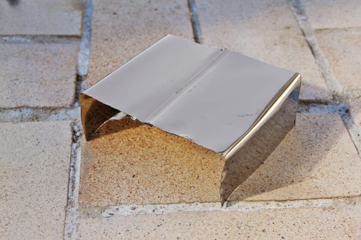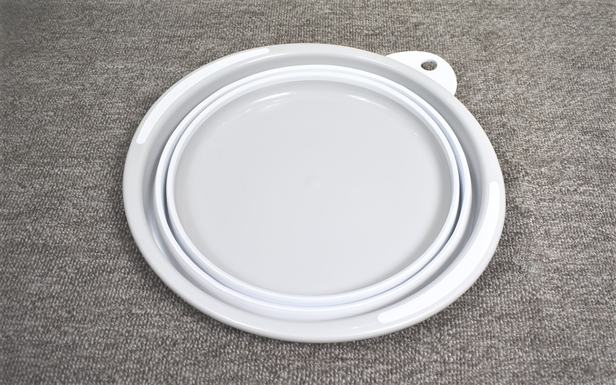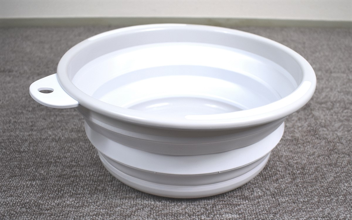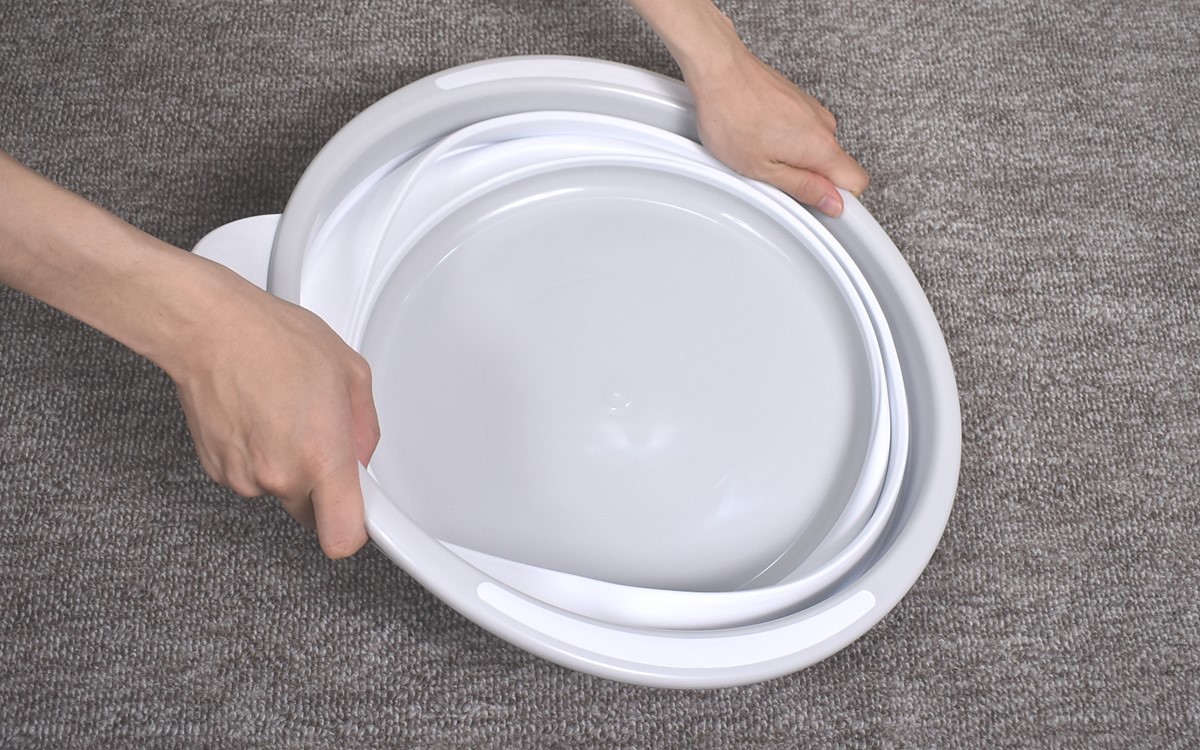 手元に届いた商品を見ていきなりびっくり。タライを注文したはずなのにぺったんこで、深みのある従来のイメージとは姿がまったく異なります。なんと同商品は、本体側面を蛇腹に折りたためるのが大きな特徴。硬質なポリプロピレン製のハンドル・枠・底に対して本体には柔軟な熱可塑性エラストマーが使われていて、折りたたまれた側面を伸ばしていくことでタライのかたちにすることができました。