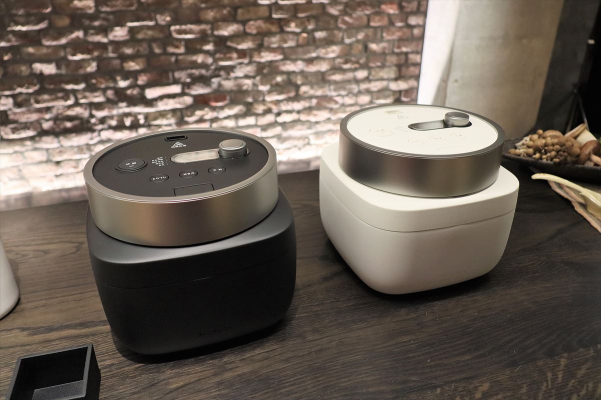 ↑新しい「BALMUDA The Gohan」。本体寸法:幅242×奥行266×高さ219mm、本体質量:約4.6kg、定格消費電力:670W、3合炊き。カラバリはブラック(左)とホワイト(右)