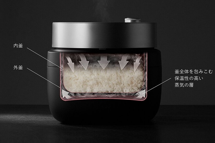 ↑新モデルの「BALMUDA The Gohan」。直販価格は4万9500円で、写真のブラックほか、ホワイトも用意されています