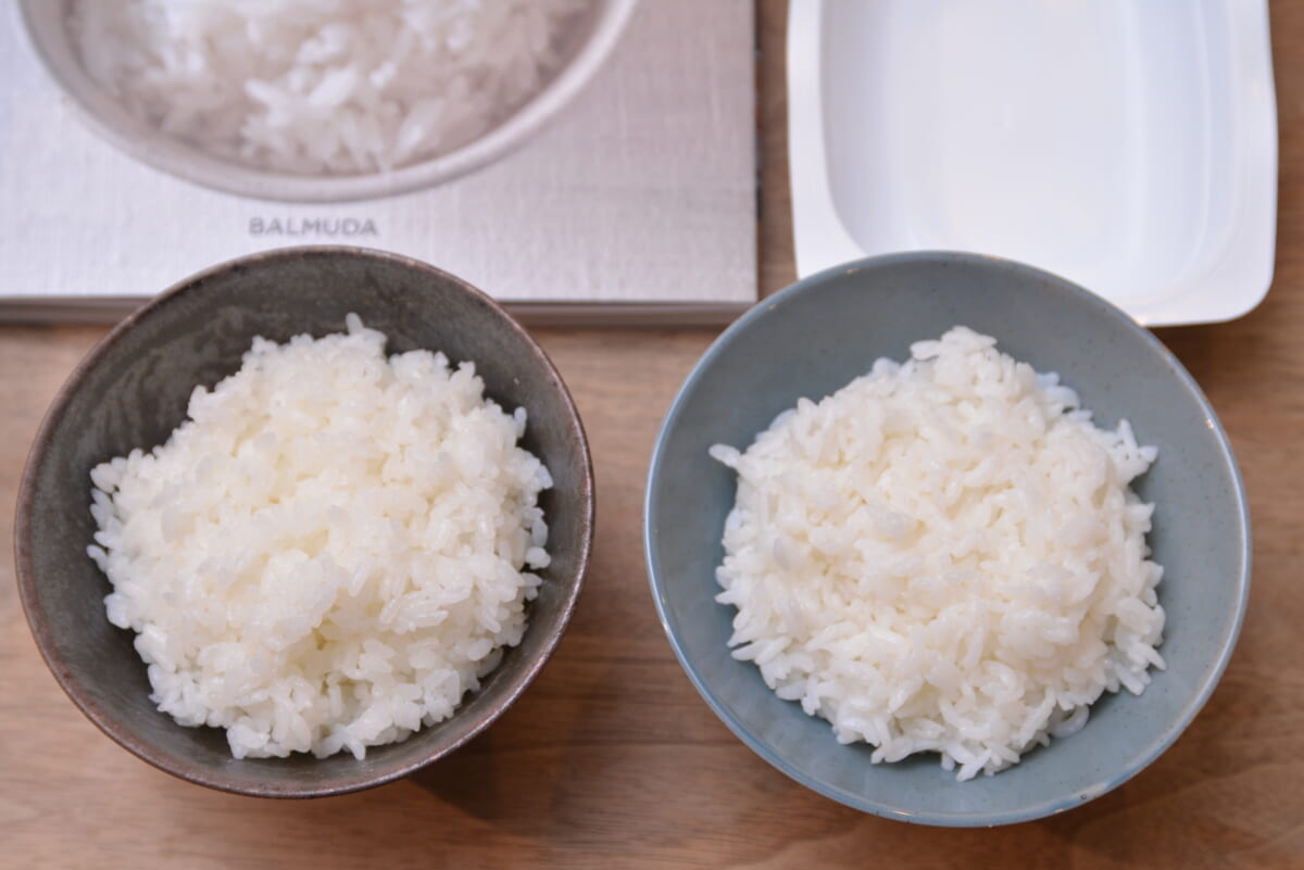 ↑左が「BALMUDA The Gohan」、右がパックご飯。どちらもコシヒカリです