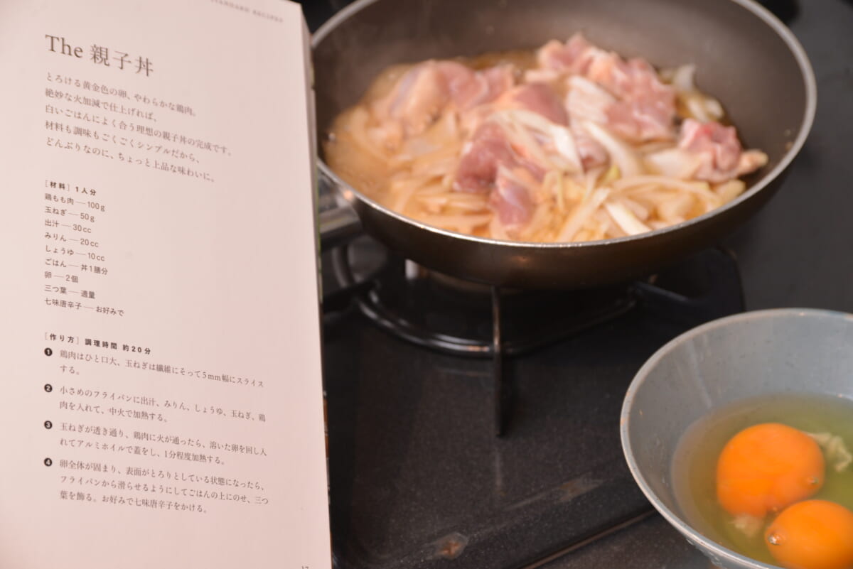 次は、先ほど白米モードで炊いたご飯とおかずの相性をチェック。まずは、オンラインストアで「BALMUDA The Gohan」を買うと付いてくる、オリジナルレシピブック(別途購入の場合1650円)を参考に「The 親子丼」を作ってみました。