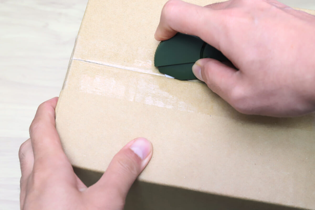 あとは、ダンボール箱の合わせ目に貼られた梱包用テープにこの刃を挿し込んで切り開くと、サクッと簡単に開梱できる。