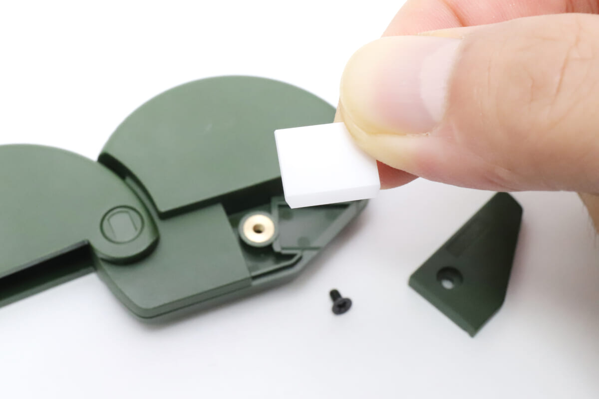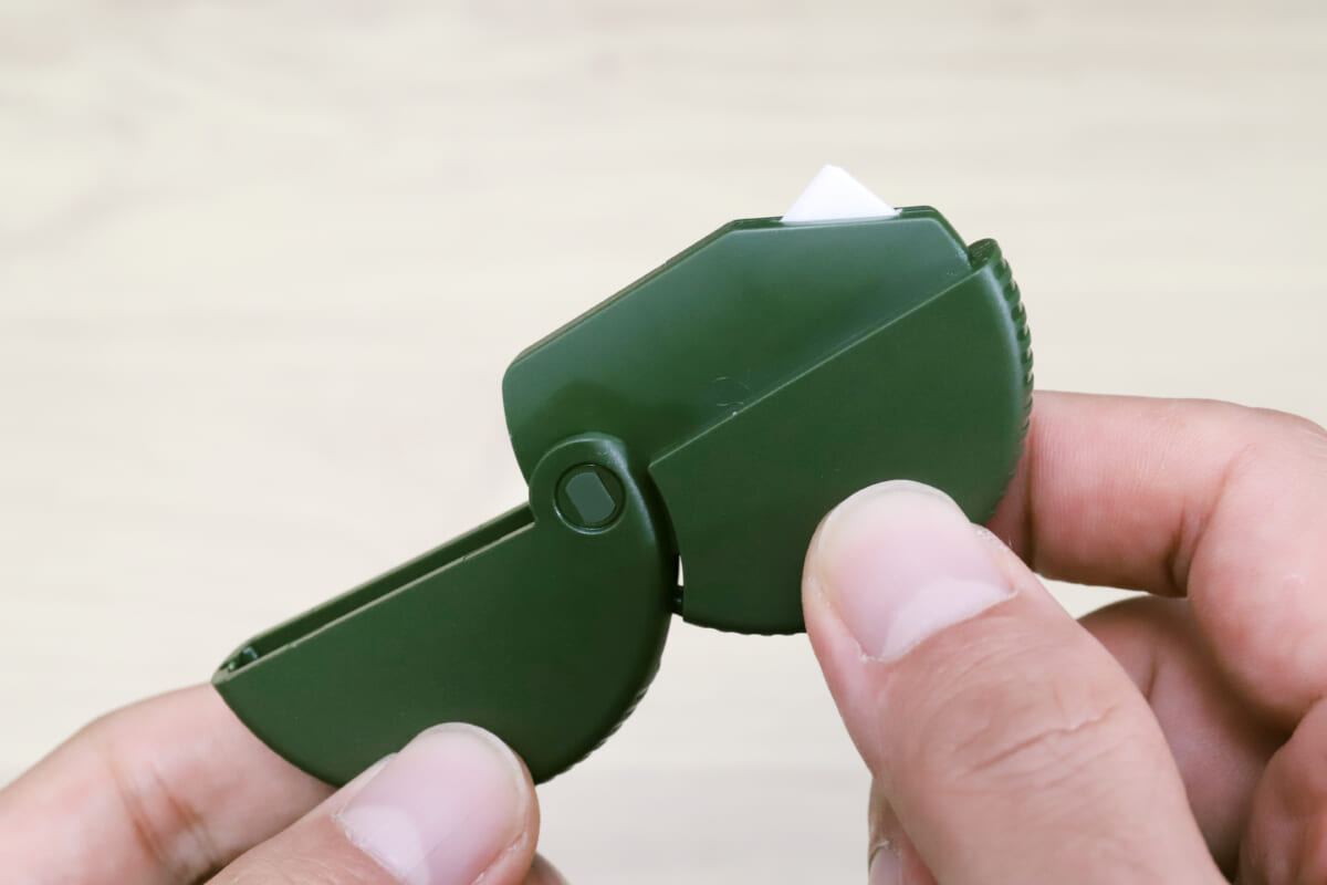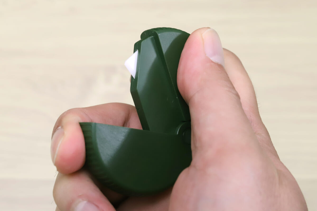 使用する際には、裏側のセーフティーボタンを押しながら上面のノックをパチッと音がするまで押し込むと、先端から小さなセラミック刃が露出する。