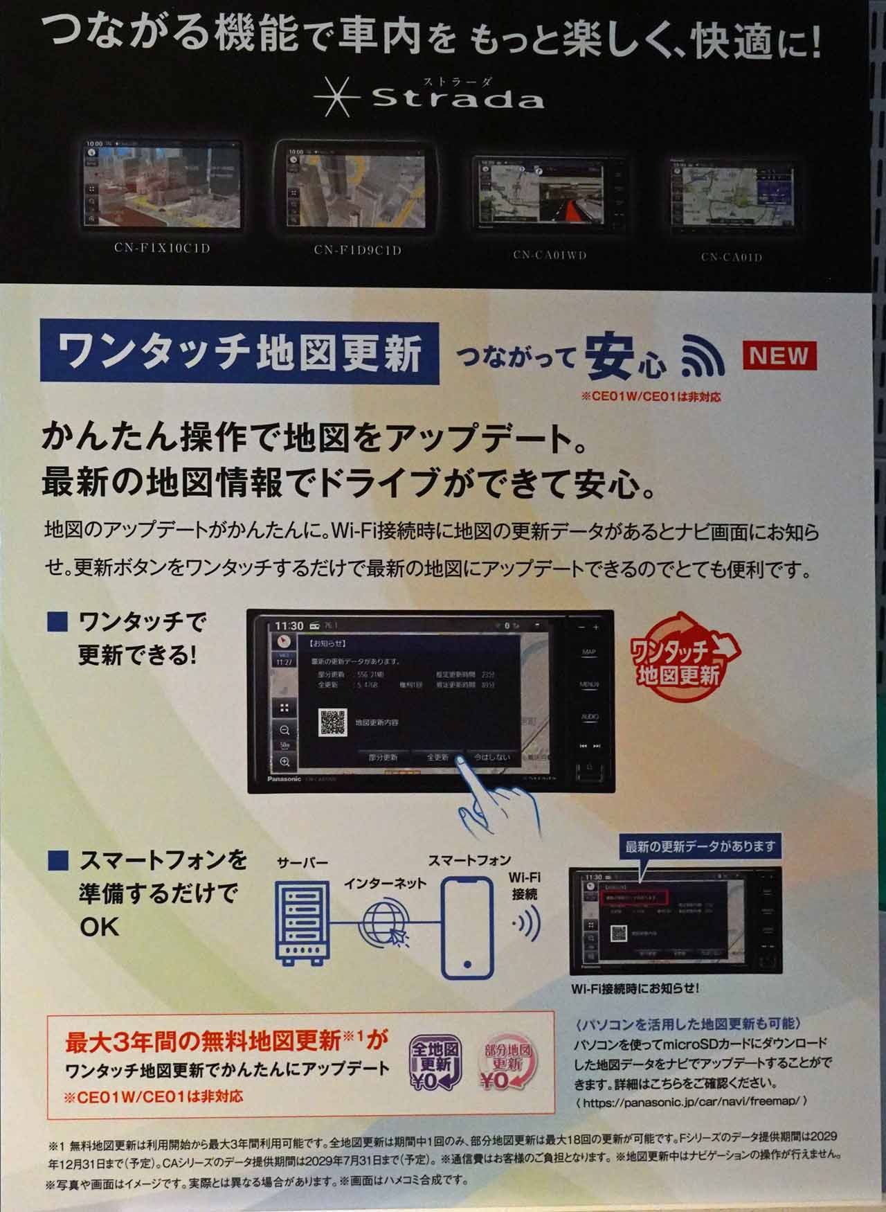ネットワーク機能の最大の特徴は、市販カーナビ初の通信量無制限、使い放題のインターネット接続サービス「docomo in Car Connect」に対応したことにあります。これはドコモの高速データ通信を使ったネットワークサービスで、地図の自動更新やYouTube動画の再生、車内Wi-Fiスポット化といったサービスが無制限でいつでも楽しめるようになるのです。