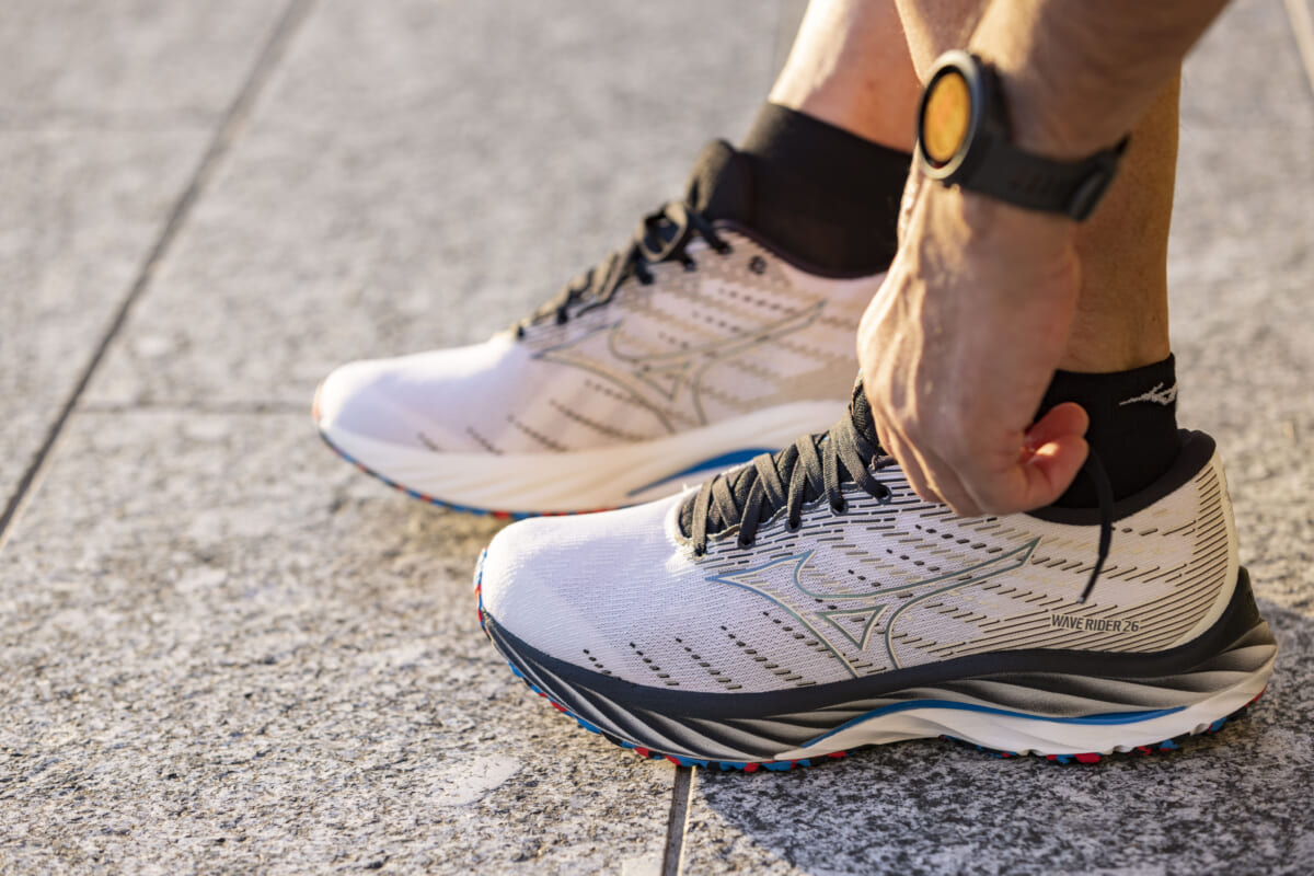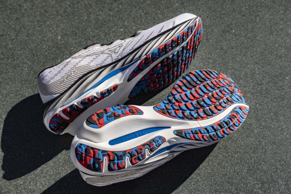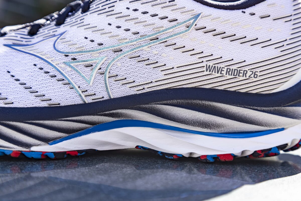 ↑最新の「ウエーブライダー26」の価格は1万4850円(税込)。プラス1個3000円という反射マーカーを全身に34個付けて走る。なんだかゴージャス!