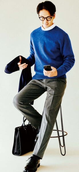 ●ザ・スーツカンパニーのジャケット1万6500円、同パンツ7480円(以上ザ・スーツカンパニー 銀座本店)、ジーユーのニット1639円(一部店舗のみ販売)、同シューズ3289円(以上ジーユー)、ソックスはスタイリスト私物