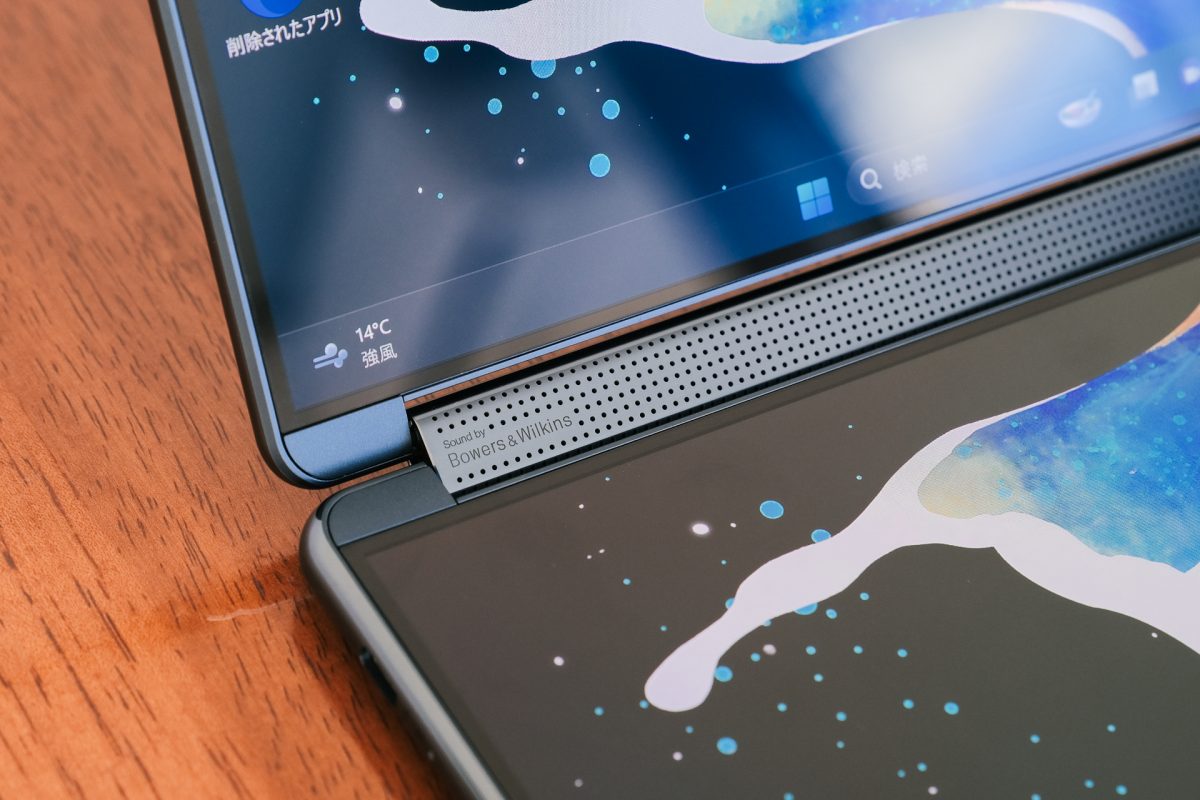 もうひとつのスタイルはディスプレイを横配置した「デスクトップモード」で、2画面合計で19.8インチのディスプレイとして使えます。Yoga Book 9i Gen 8と違いディスプレイのヒンジ部分に段差があるものの、真正面から見る分にはあまり気になりません。同じ2画面ノートといえど、細やかな部分に差異が見られますね。