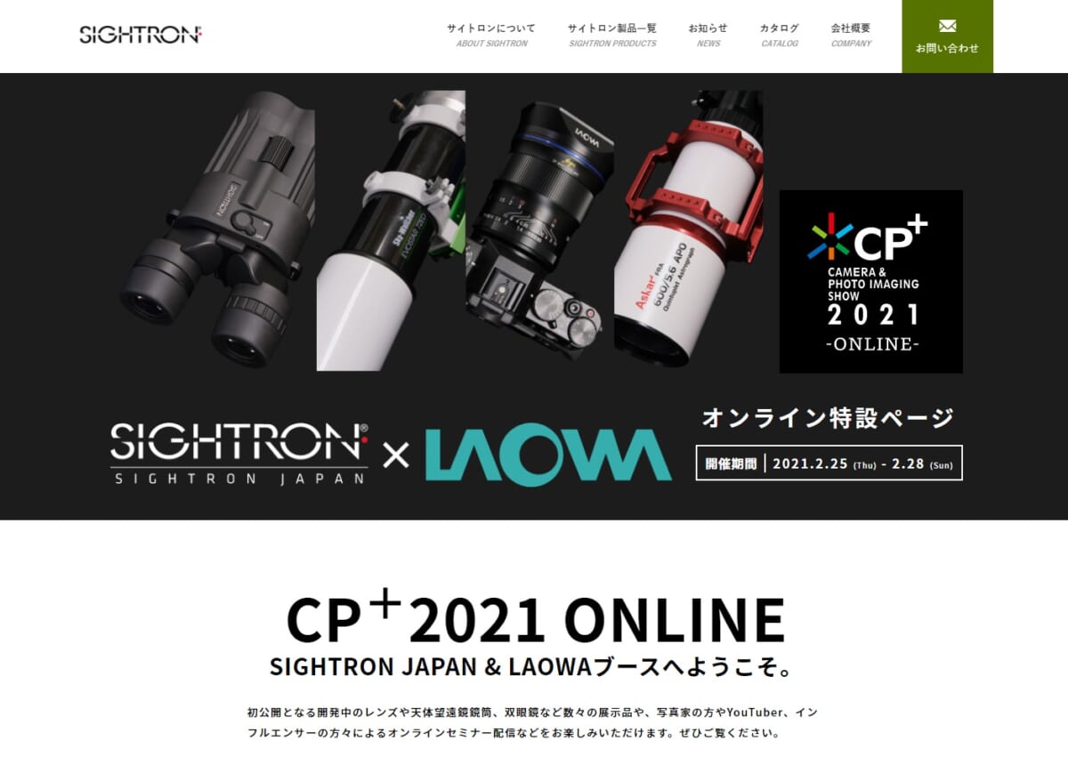 サイトロンジャパンは、米国サイトロン社の双眼・単眼鏡などの光学機器を扱っているメーカーです。最近は、中国LAOWA(ラオワ)社の低廉でユニークな交換レンズを扱っていて、カメラファンの注目を集めています。CP+2021では、試作品を含むLAOWAの製品紹介のほか、サイトロンの双眼鏡、スカイウォッチャーやシャープスターの天体望遠鏡などを紹介。天文関連を含めて計16コマのセミナーも実施しました。