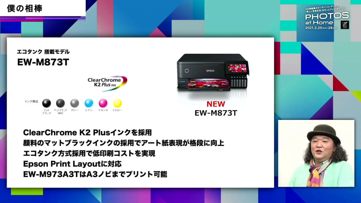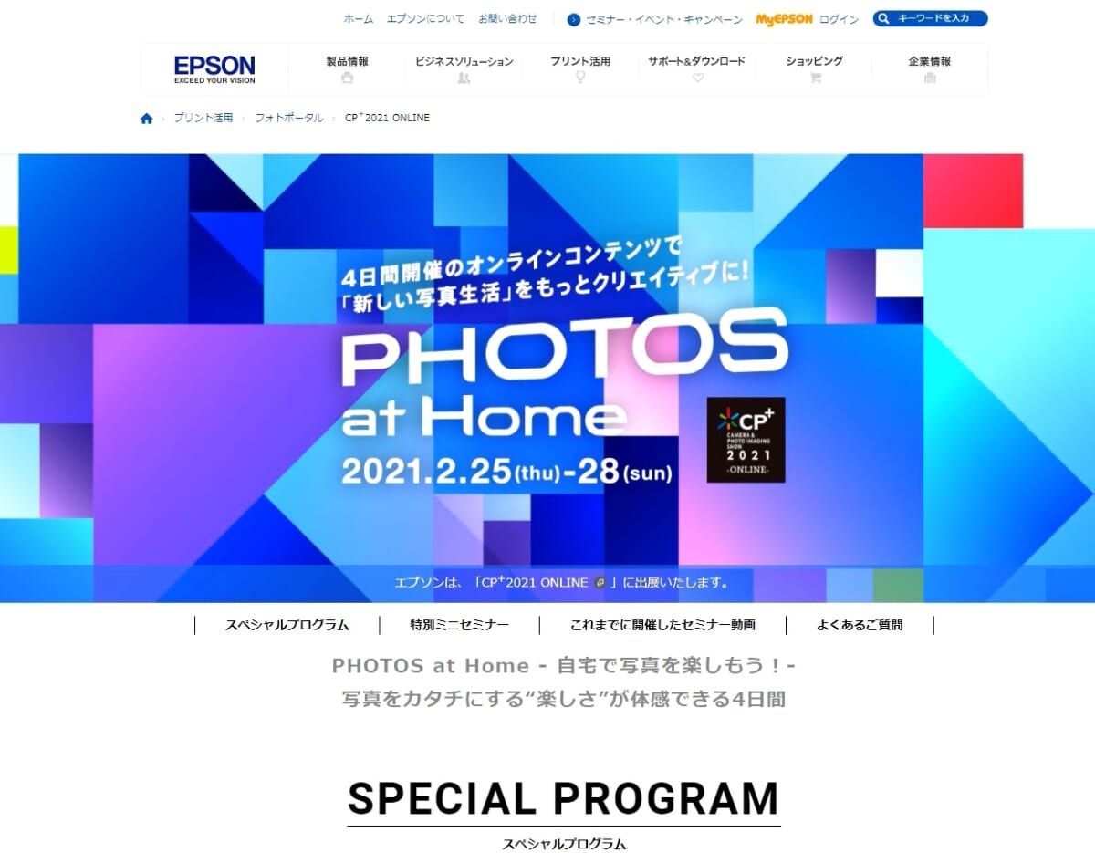 プリンターやスキャナーのメーカーとしておなじみのエプソンでは、「PHOTOS at Home」をテーマに自宅での写真の楽しみ方を提案。スペシャルプログラムとして4本の動画を公開したほか、同社製品を紹介するだけでなく使用目的に合わせたプリンターやスキャナー選びができるように工夫されていました。