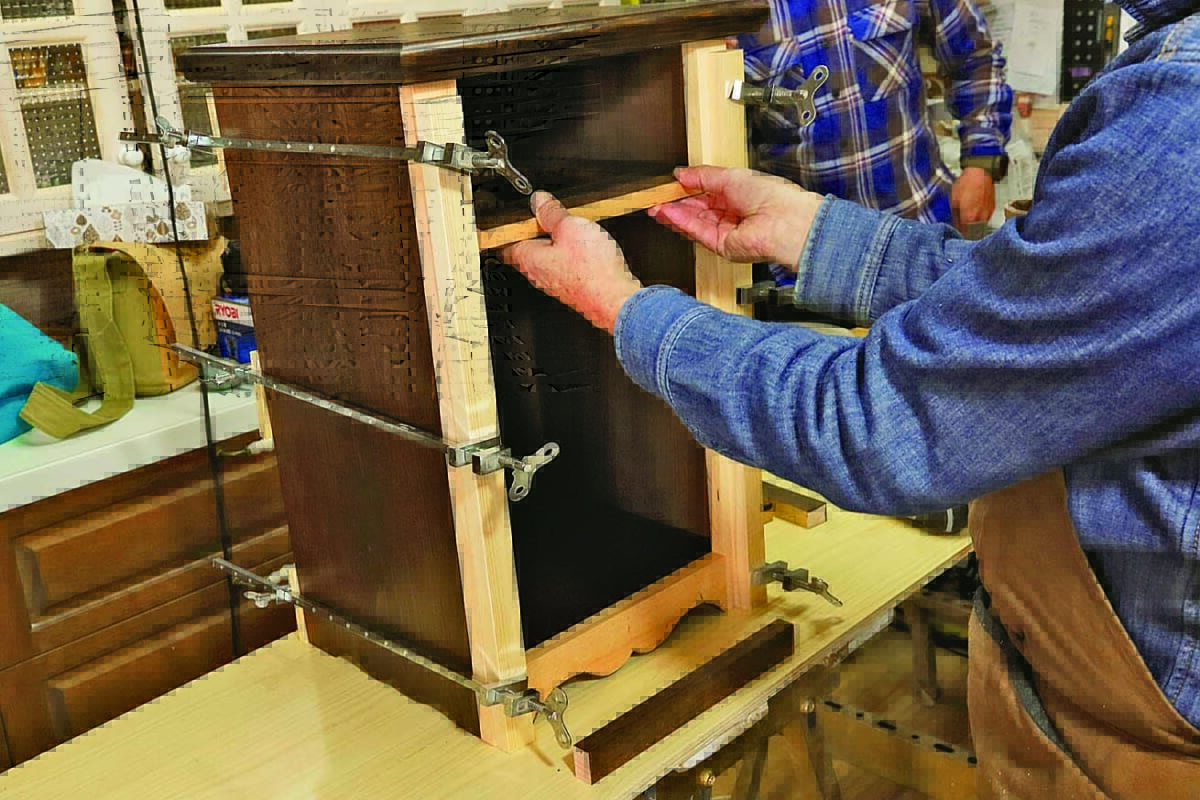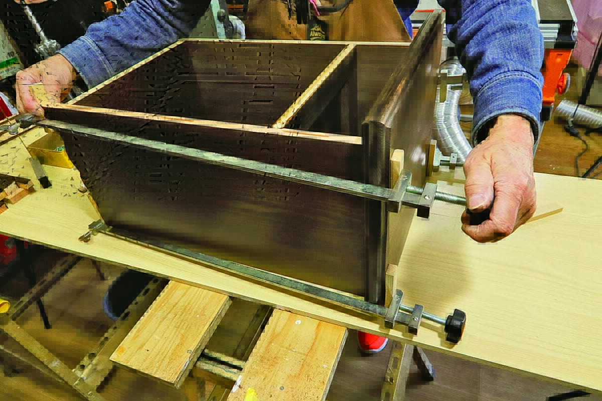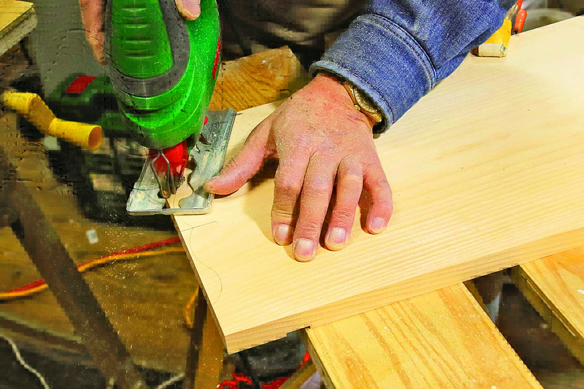 5.クランプで木材を作業台に固定し、下書きに沿って切断していく。
