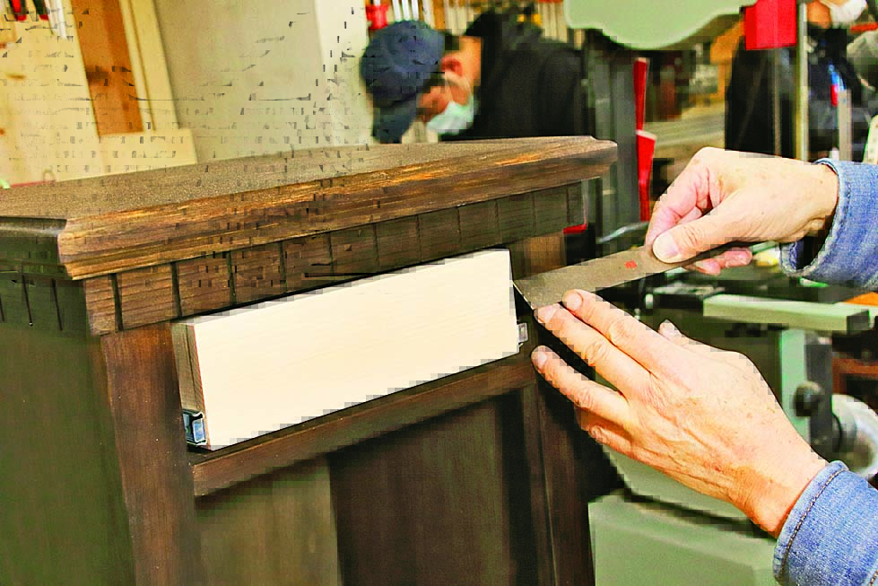 切削時の木くずなどを木材の表面からウエスで丁寧に拭き取ります。