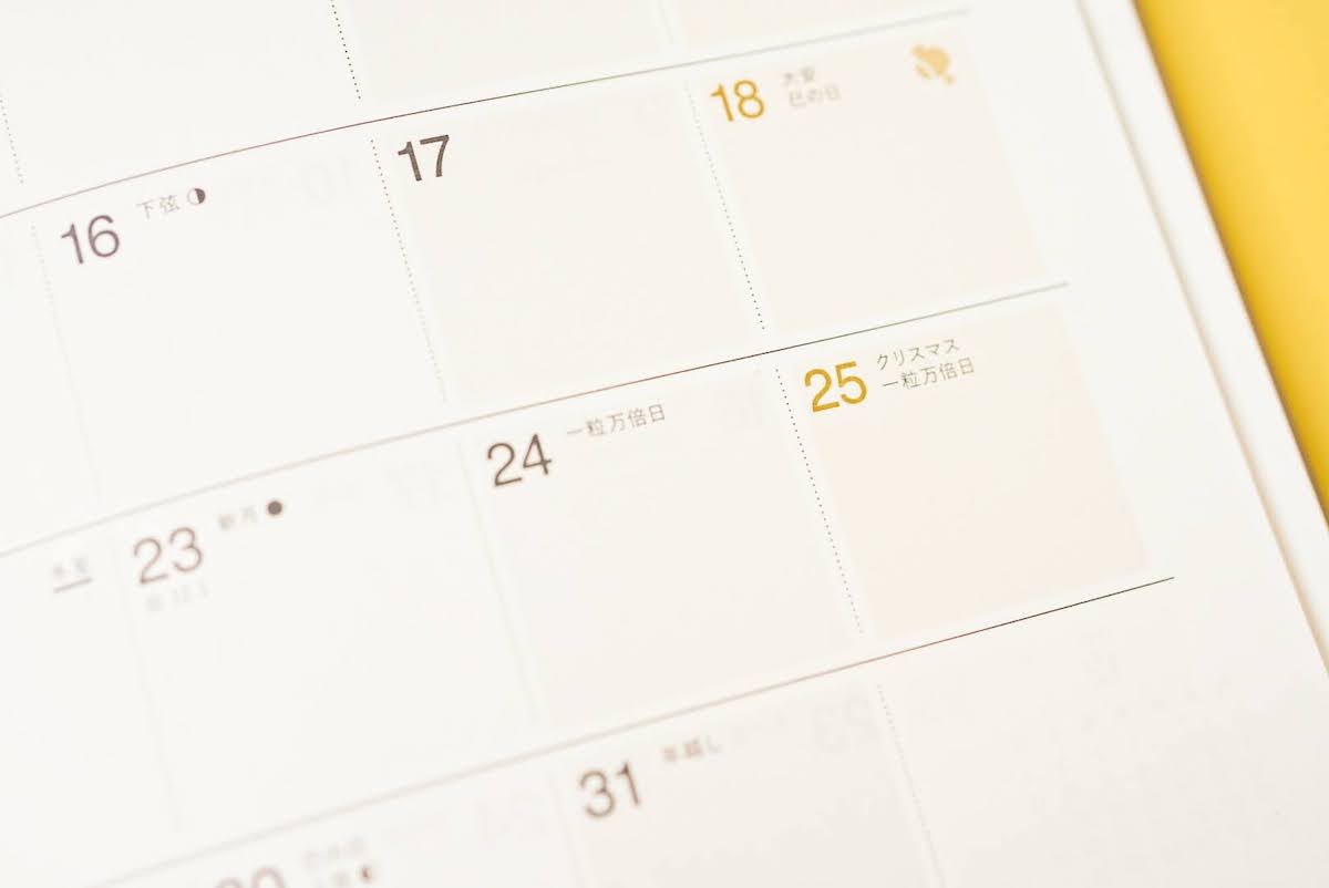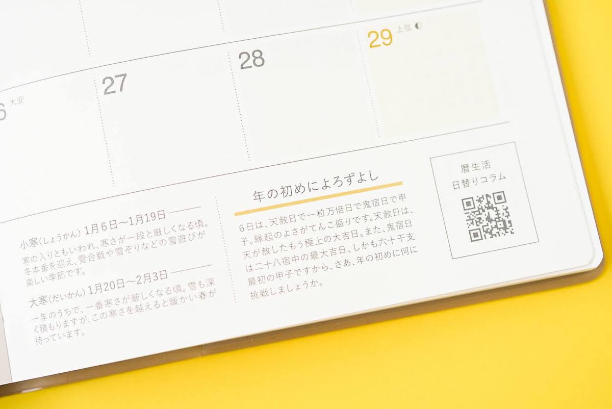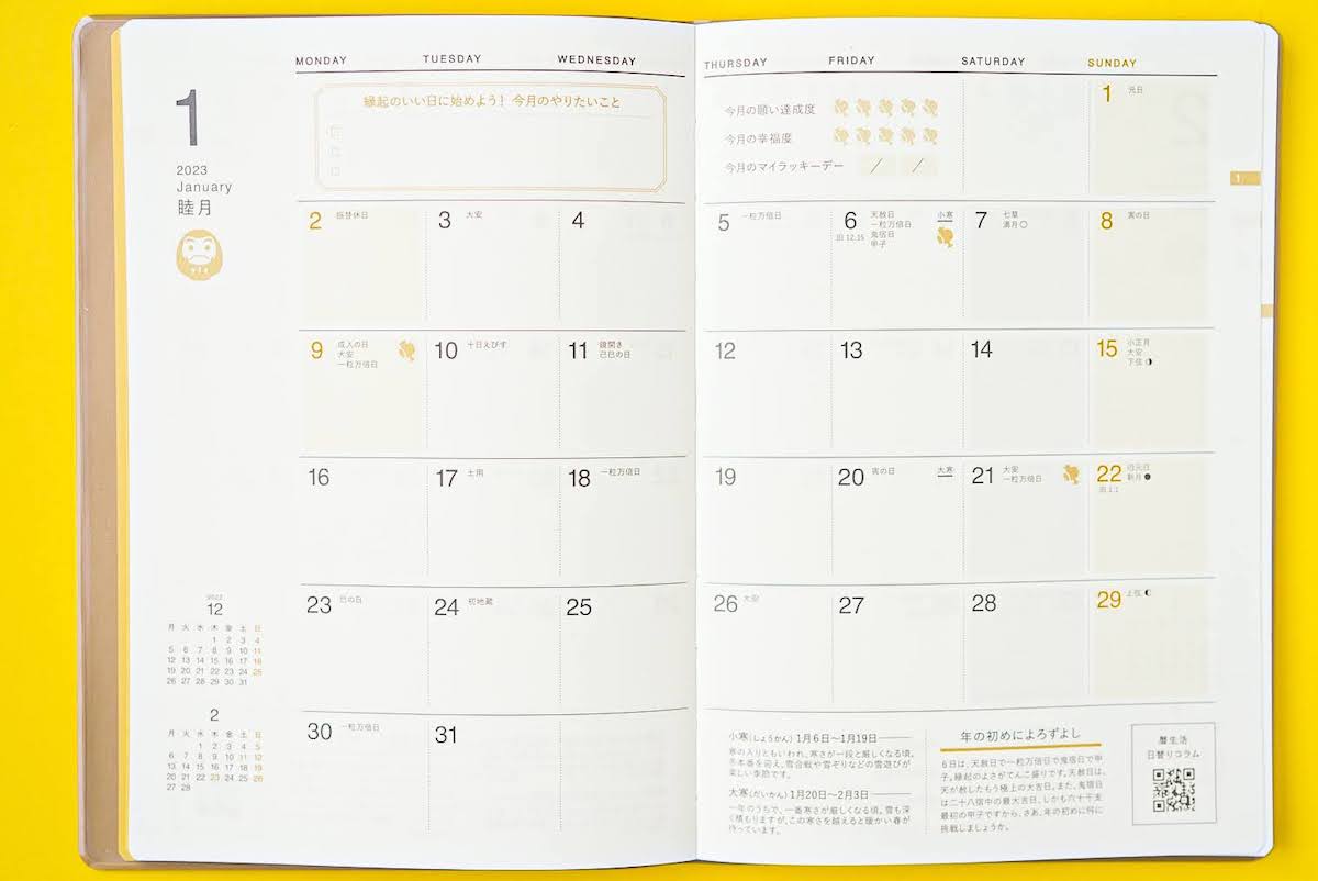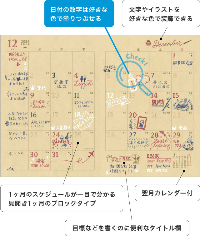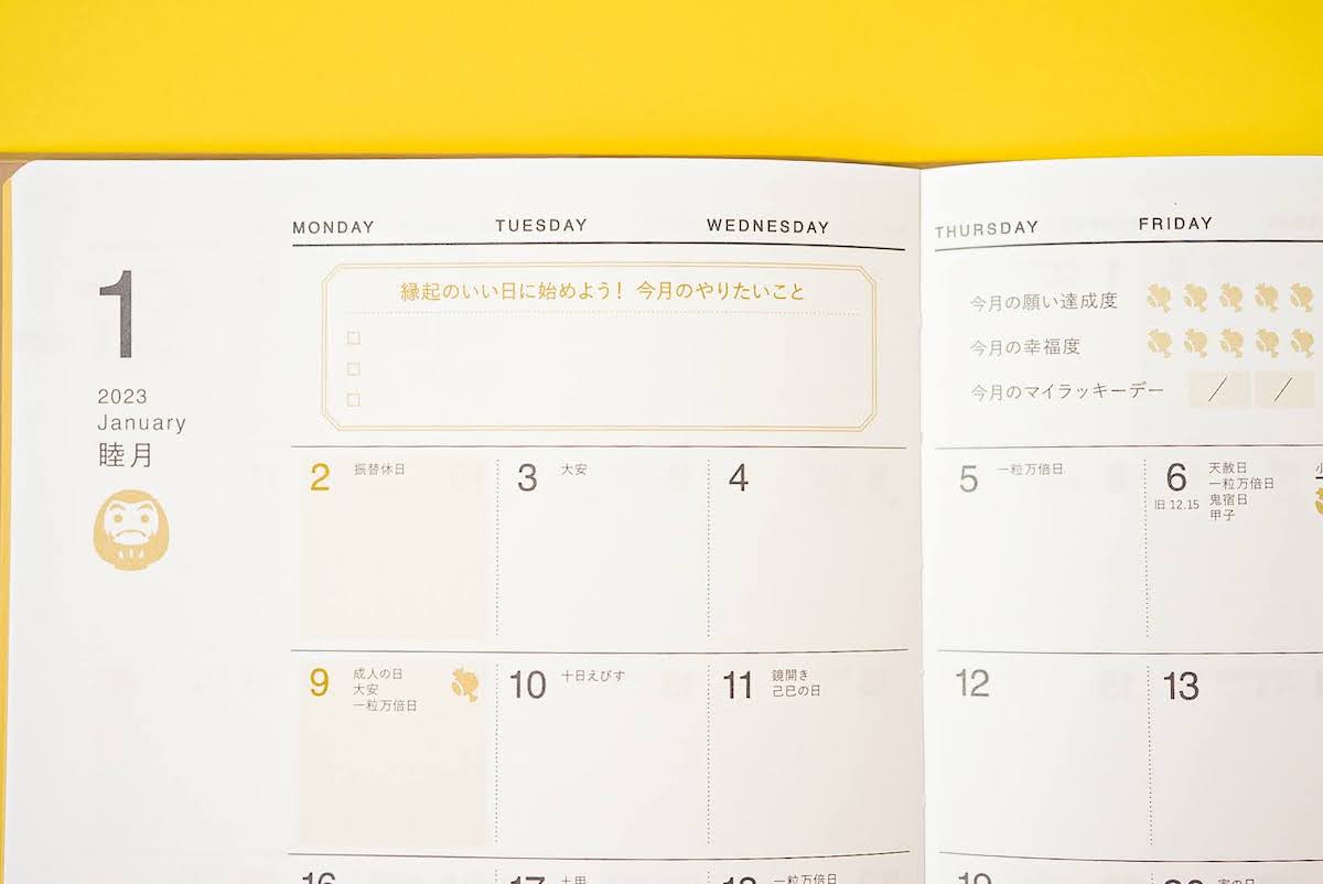 ↑「開くと、すべてのページで予定やライフスタイルに合わせて、自分らしくページを彩れるデザインになっています。カレンダーの数字にも色がついていないので、土日休みでない方やシフト制で働いている方は、休日を赤く塗ってもいいかもしれません。余白も多めに取られているので、自由に書き込める楽しみもありますよ」
