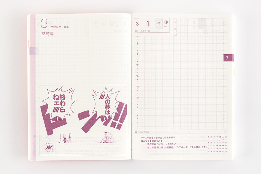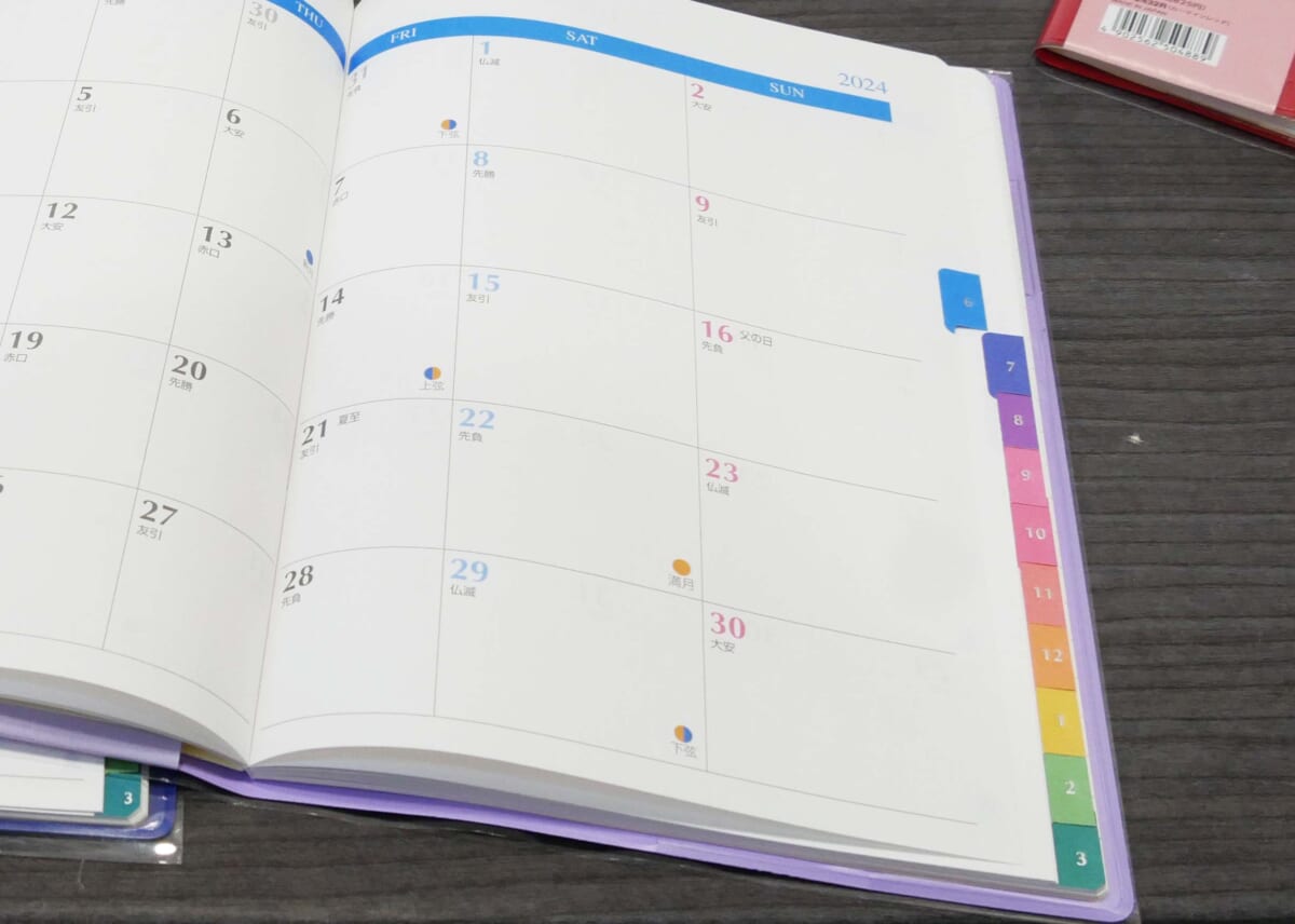 ↑さらにこのスケジュール帳には、便利な仕掛けが施されています。手帳の上部(グレーの部分)を手で押さえてパラパラとめくると、仕事用のページだけが開かれ、下部のピンク色の部分を手で押さえると、プライベート用のページのみが開かれるという仕組みなんです。会議中にうっかりプライベートのページを開いて公開してしまう心配がありません