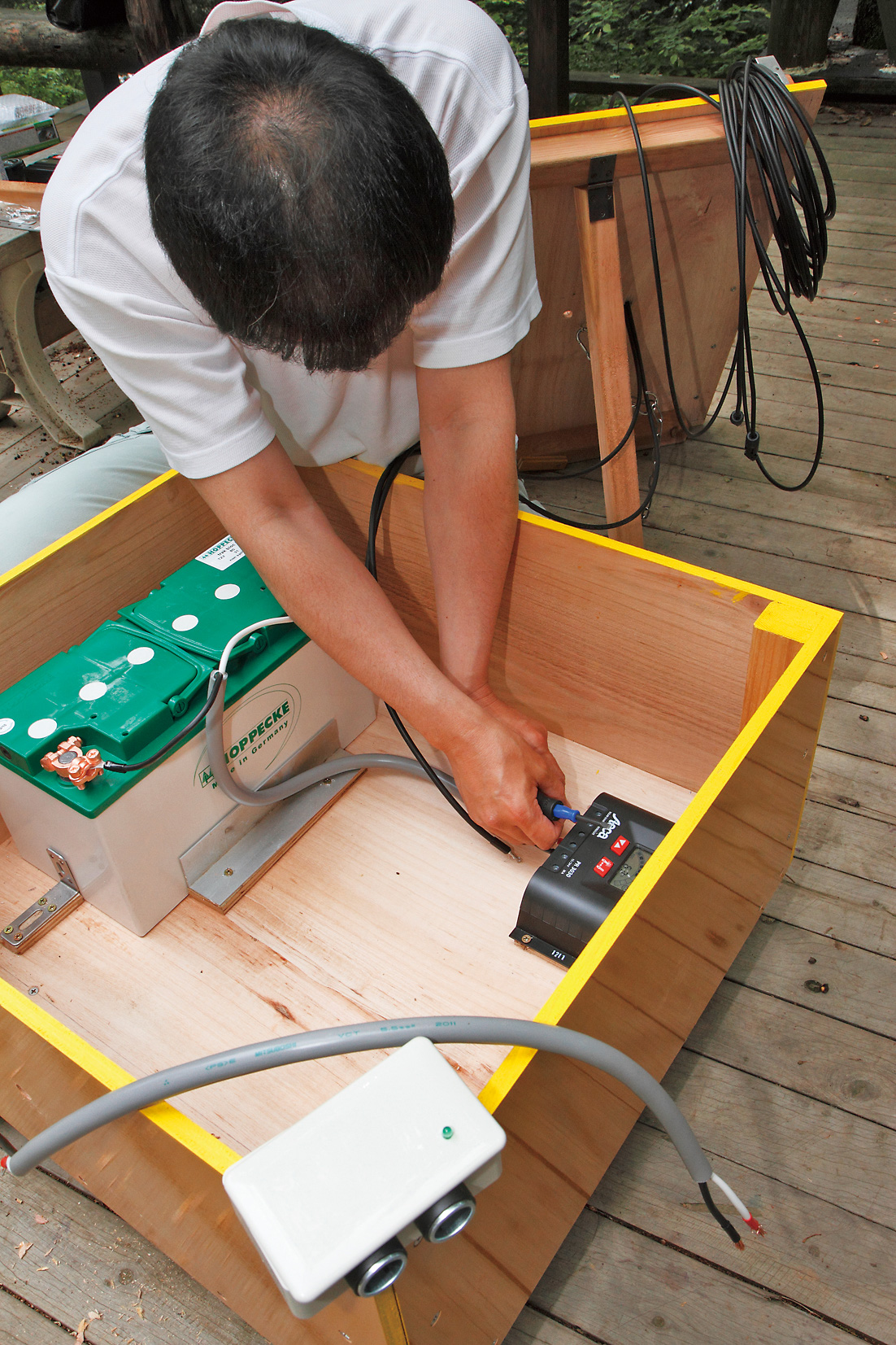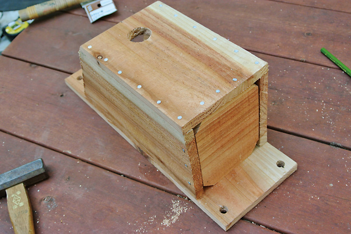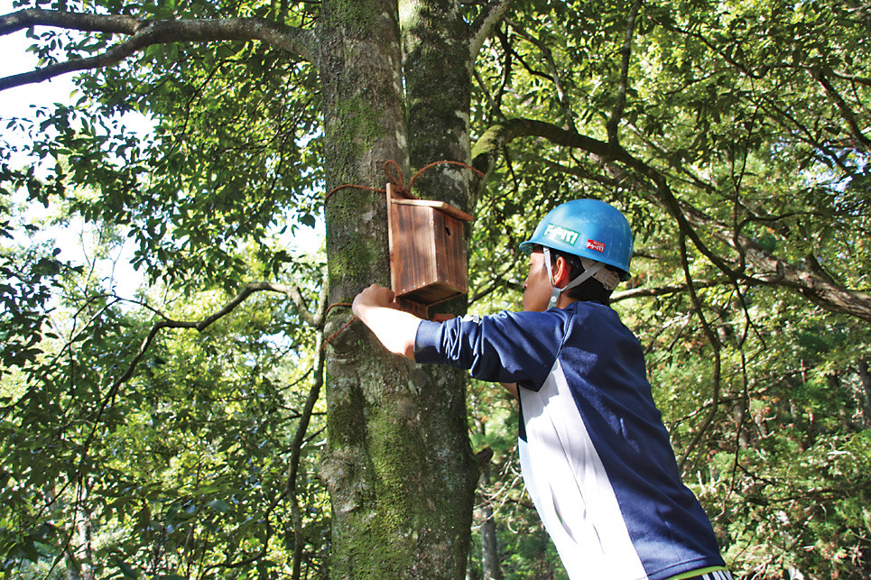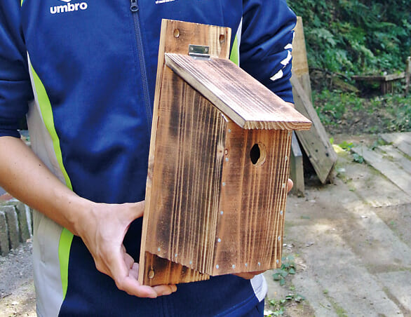 ドゥーパ!(以下D) 巣箱を掛ける時期は? Fさん(以下F) シジュウカラ(留鳥)の場合11〜1月。繁殖期に入った春では遅い。アオバズクのような夏鳥の場合は春(3〜4月)がいいだろう。 D 巣箱を掛ける場所は? F 巣箱を掛ける高さは1.5〜3m。これより高いとスズメと競合して負けることもある。木でも電信柱のような人工物でもいい。木に掛ける場合、枝葉が茂っていないすっきりした場所がいい。枝葉が茂っているところは蛇などの外的侵入があるのでシジュウカラが恐れるからだ。東西南北の位置は関係ない。また、複数の巣箱を掛ける場合、巣箱の間隔は10m以上。ひとつのつがいで10m程度の縄張りがあるからだ。 D 巣箱の掛け方は? F 巣箱はやや下向きに掛けること。雨水が入ることや明るくなりすぎるのを鳥は嫌うのだ。また、人工物に掛けるなら針金でもいいが、木に掛けるときはシュロ縄などで固定したい。水に浸して湿らせた状態で木に縛りつけると、あとで収縮してがっちり固定できることも知っておきたい。 D ワカリマシタ。 F 成功を祈る…