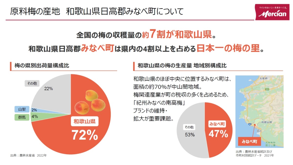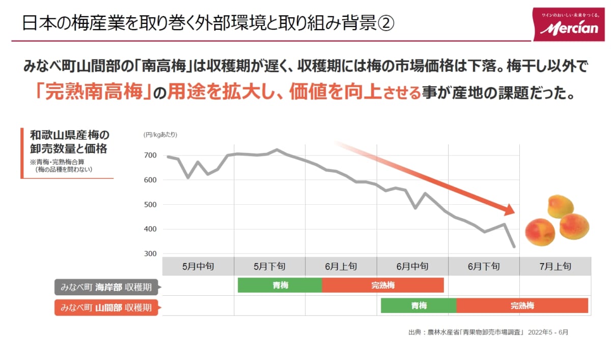 ↑梅干し以外で完熟南高梅の用途を拡大することは、みなべ町の急務だったのです(メルシャンの資料より)