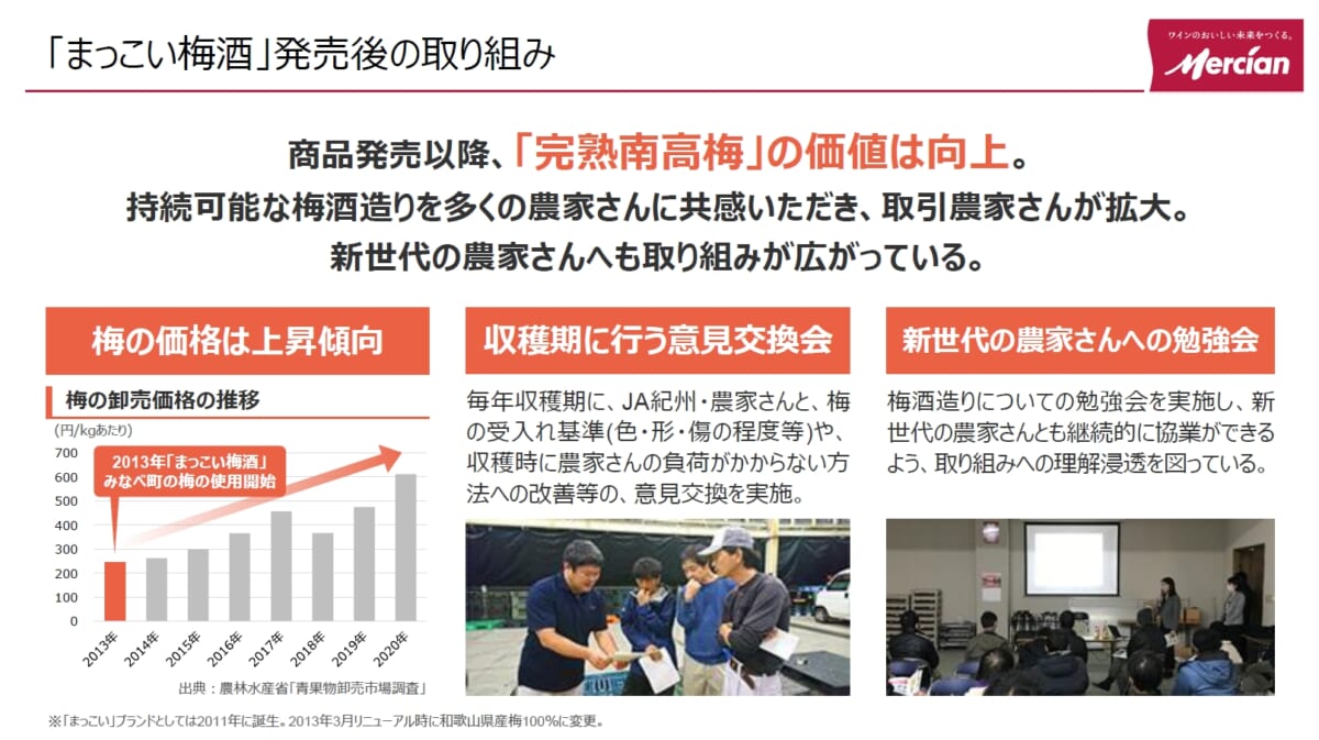 なお2011年の「まっこい梅酒」発売以降、メルシャンが安定した価格で完熟南高梅を仕入れることで価値は向上。また、他社でも完熟南高梅を使った梅酒が商品化されたり、ピューレ化したジャムやシロップが販売されたりと用途も拡大。現地における梅の卸売価格も上昇傾向となり、ブランドは守られました。加えてみなべ町の山間部では梅生産の意欲も年々高まり、園地拡大を積極的に進めている若い生産者が増えているそうです。