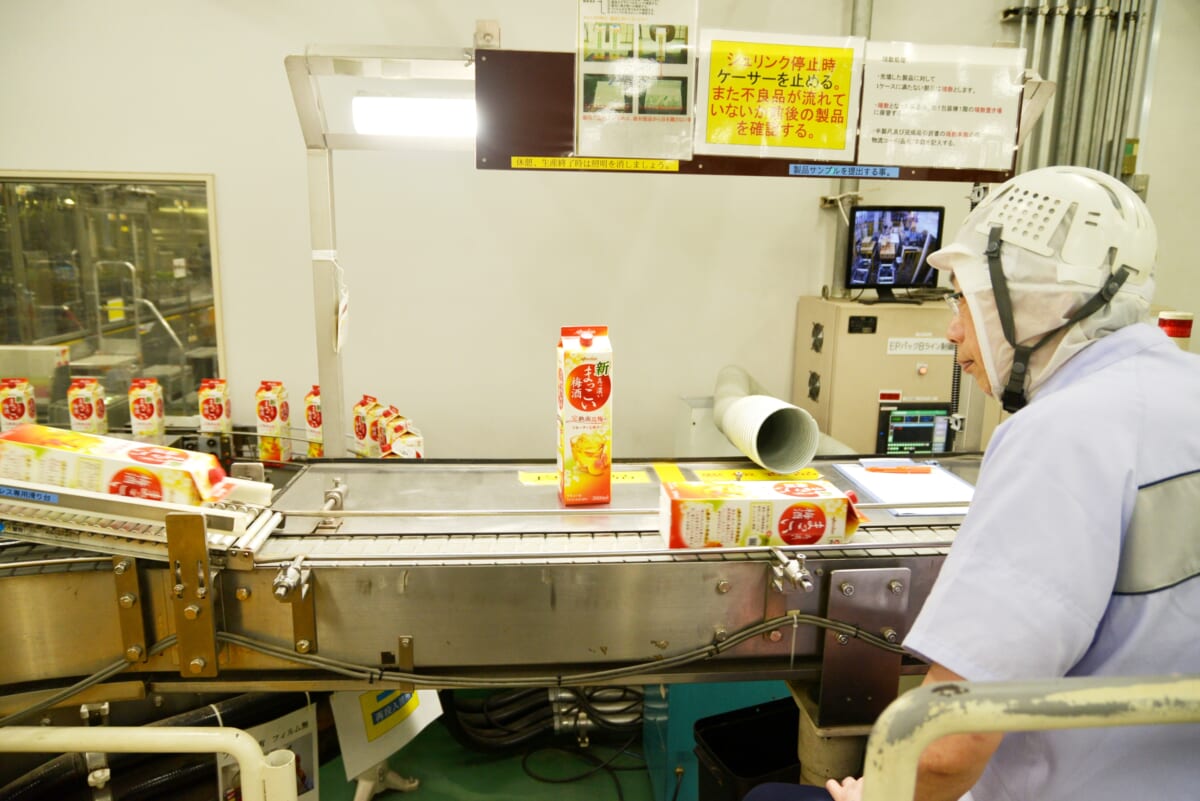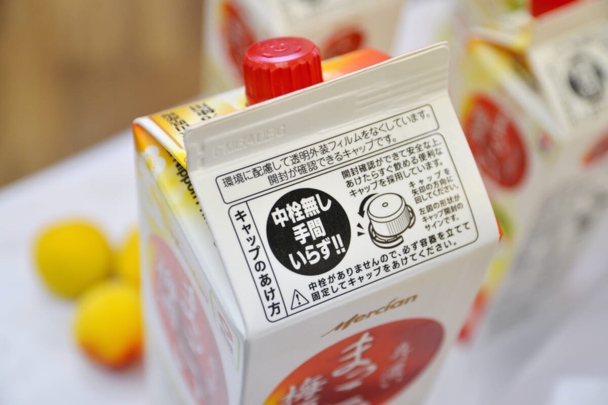 そのため取材時に見学できたのはほぼ最終工程にあたる検品や箱詰めでしたが、安全面など大前提として取り組むことのほかに、同社が積極的に行っているのが環境への配慮。「まっこい梅酒」に関しては開封確認可能なキャップを採用することで、1000mlと2000ml商品のシュリンクフィルムを廃止に。