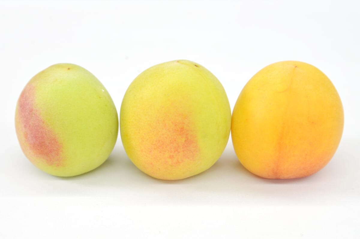 ↑左から、青梅、樹上完熟梅、完熟落下梅。「まっこい梅酒」に使われているのは右端の完熟落下梅で、香りは梅というより桃に近く、驚かされました