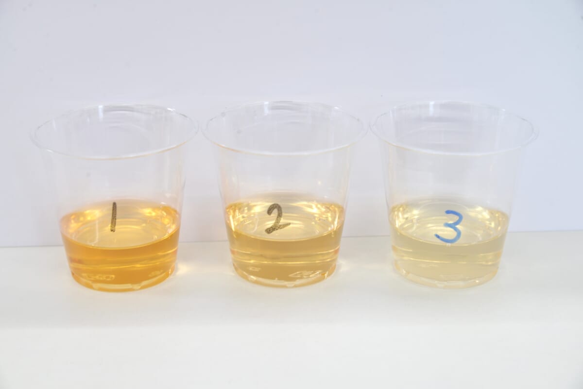 ↑1は生果を漬け込んだ原酒(「まっこい梅酒」には不使用)、2が「凍結完熟浸漬製法」による原酒で、3が「豊潤たね熟製法」の原酒