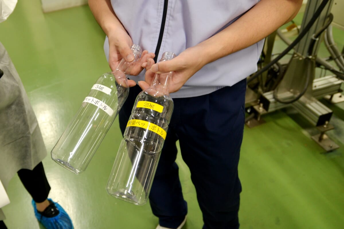 ↑こちらが「おいしい酸化防止剤無添加ワイン」の新旧ペットボトル比較。720mlボトルを従来の34gから29gに軽量化することで、年間約286トンのCO2排出量削減を見込んでいるとか
