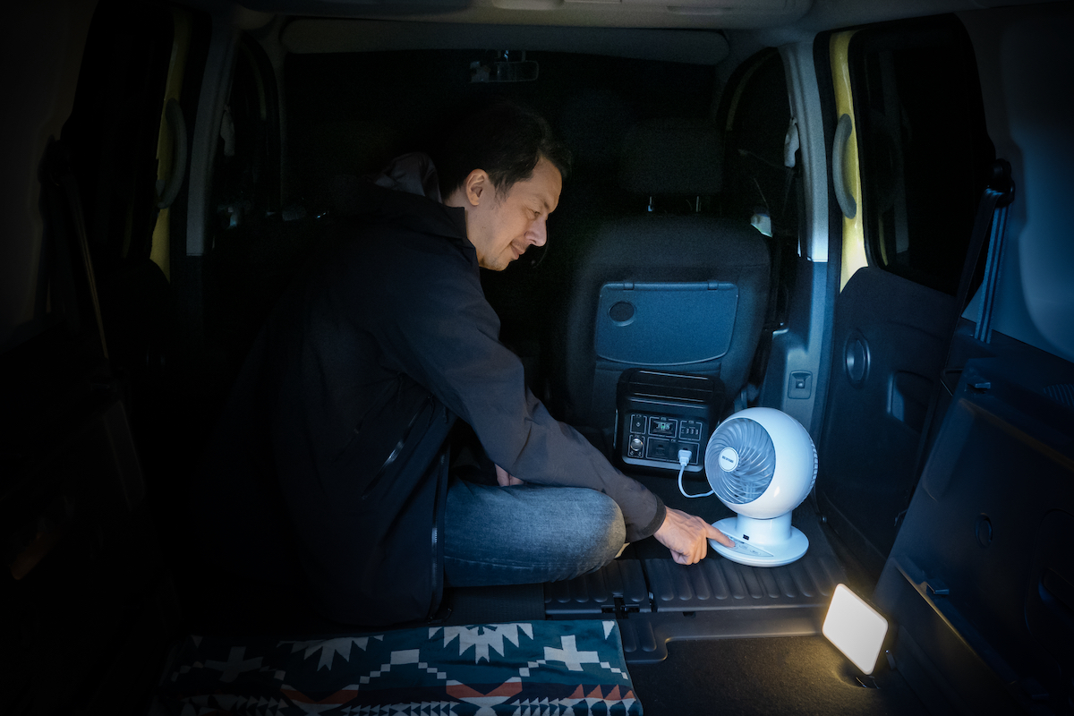 ↑車中泊で「PORTABLE POWER STATION」にサーキュレーターをつなぐ桐島さん。本企画には【車中泊編】や【防災編】もあるのでぜひ一読を