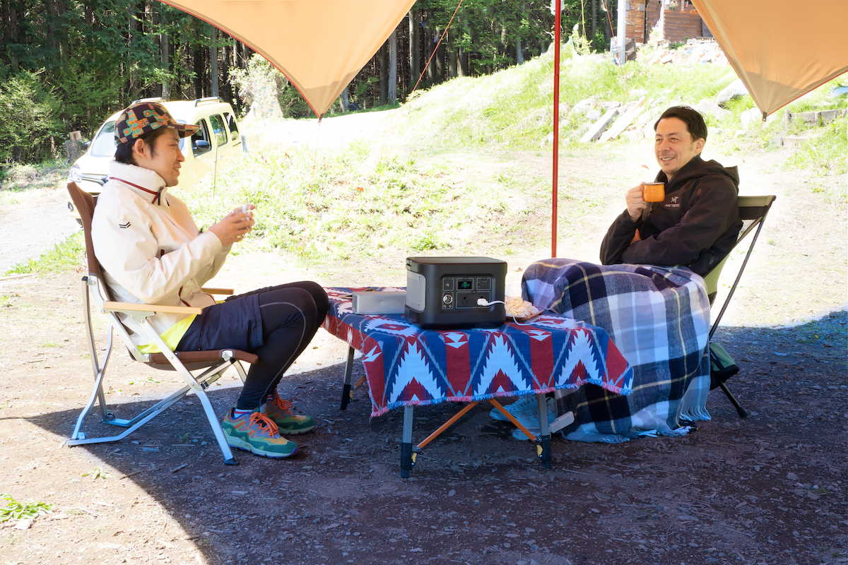 それでは本題。桐島さんと山田が「PORTABLE POWER STATION」をキャンプ場で使い、ガジェットや家電をつないで得られるメリットや印象を対談形式でお届けしていきましょう。