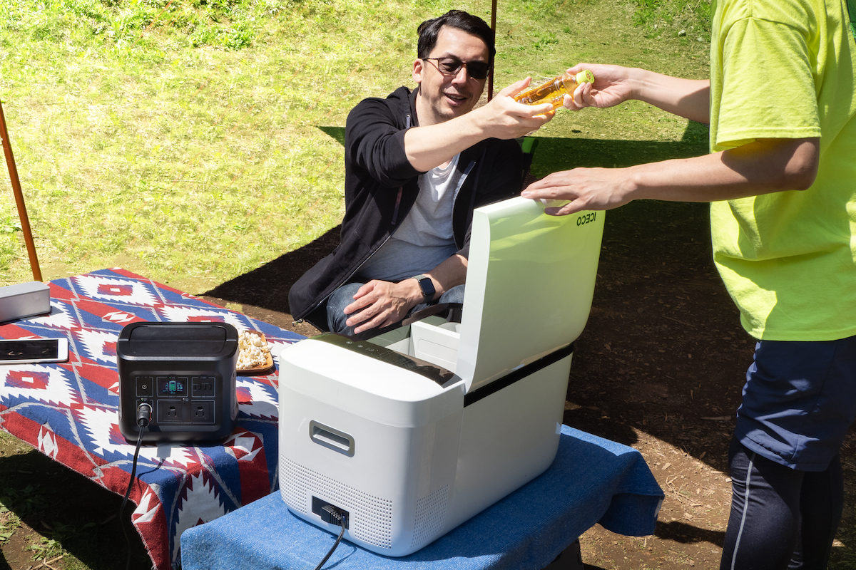 桐島 「家にいるときから冷やしておいて、クルマでの移動中はこの冷蔵庫とシガーソケットでつないで、キャンプ場ではPORTABLE POWER STATIONで冷やすと」
