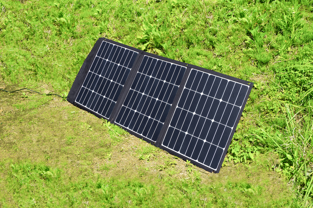 ↑「PORTABLE POWER STATION」と同時発売の「SOLAR PANEL CHARGER 120W」を使用。3つに折りたたんで持ち運べ、スタンド付きなので設置も簡単です