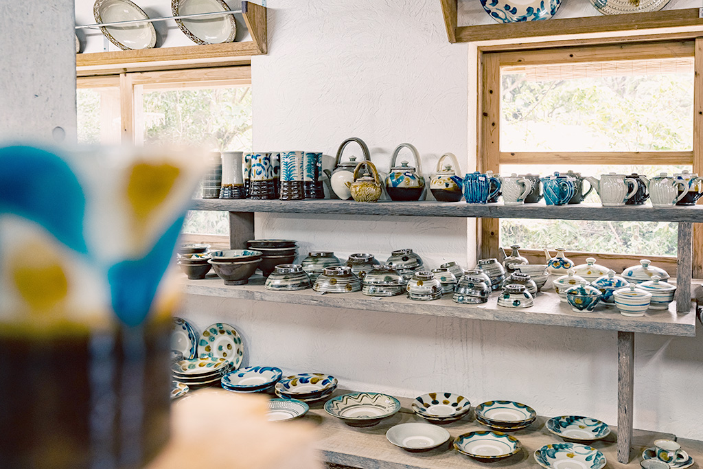古伊万⾥⾵の絵やポップな⾊遣いが⼈気の陶芸ユニット「studio wani 」や、九州を代表する⼩代焼の窯元・ふもと窯の若手・井上亮我 、1688年の開窯以来続く窯元「⿓⾨司焼企業組合 」など、全国から厳選されたうつわが並び、ストーリーを感じ取ることもできます。