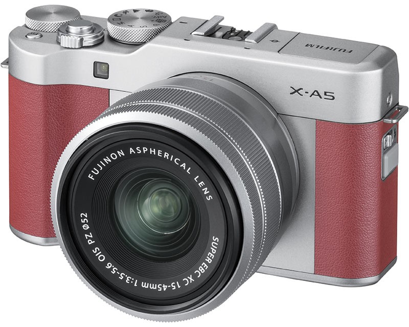 FUJIFILM X-A5 レンズキット。カラーバリエーションはブラウン(上)、シルバー(左)、ピンク(右)の3色。小型軽量ボディで、キットレンズ装着時はXシリーズ最軽量の496g*。
