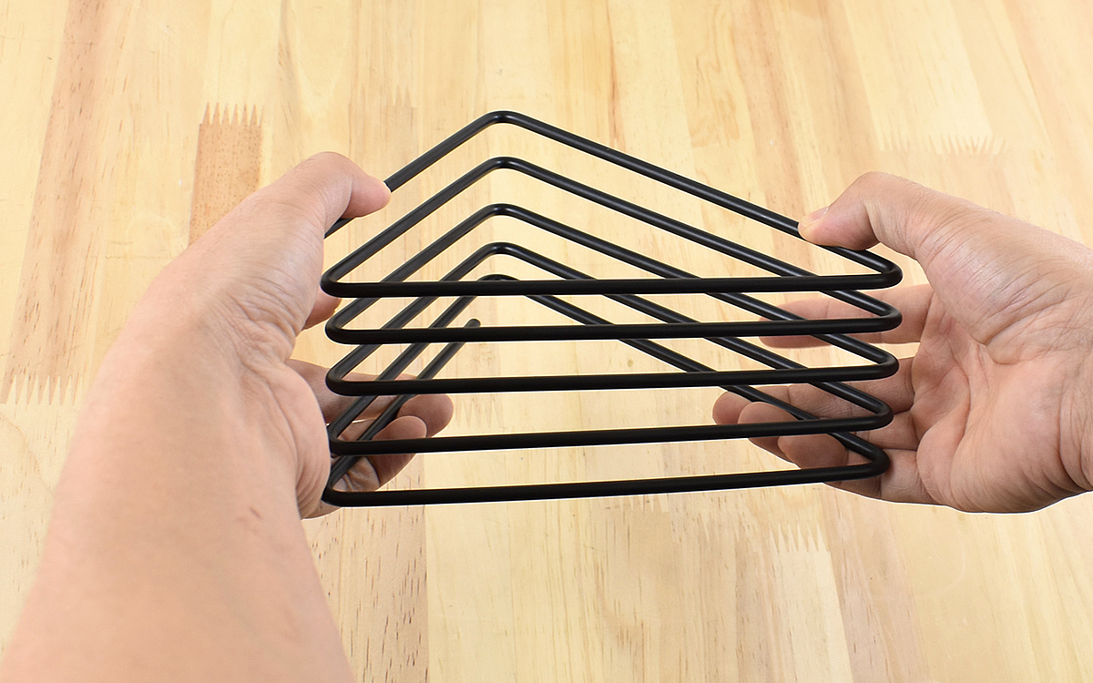 「本品1つでバスタオル2枚、フェイスタオル2枚ほどを干せるので、ハンガーを複数揃える手間が削減。フックにも吊り下げられるホールを装備しており、花粉の季節の室内干しがはかどります」(金矢)