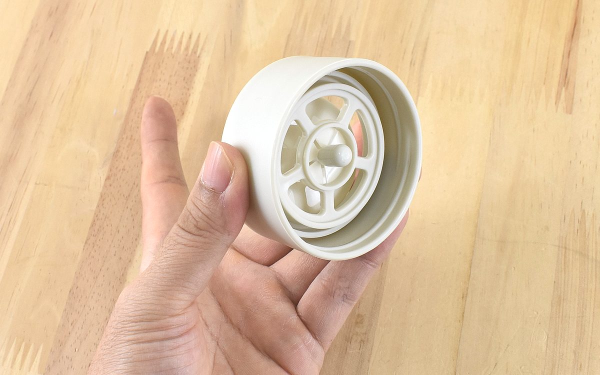 「2本の指でつまんで回せるほど軽いので、小さい子どもでも使えます。底部に滑り止めがないため、上からしっかりとフタを押さえるか、濡れた台拭きを敷くなどすると効率良く回せます」(金矢)