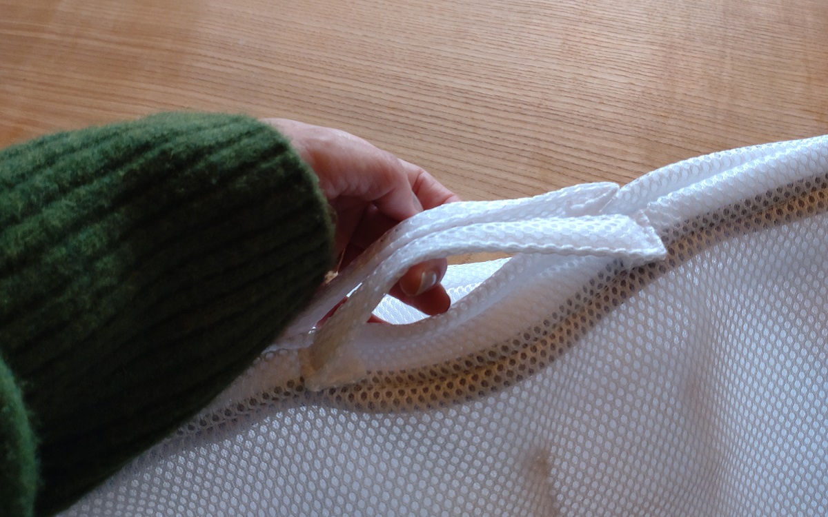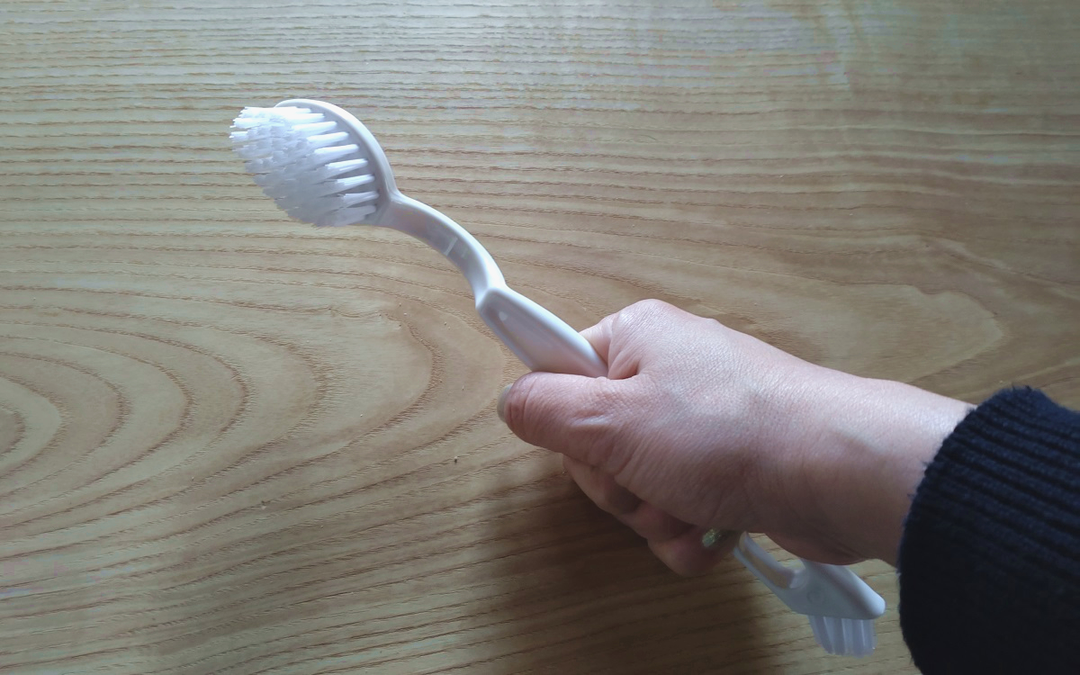 「ナイロン面は洗い物に密着し、油分が多い汚れもスルッと落ちてキレイな仕上がりに。ポリウレタン面の凸凹で、細かい目のザルも洗いやすいです。もうひと回り大きいほうが握りやすい印象」(金矢)